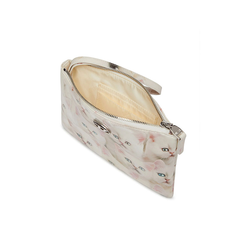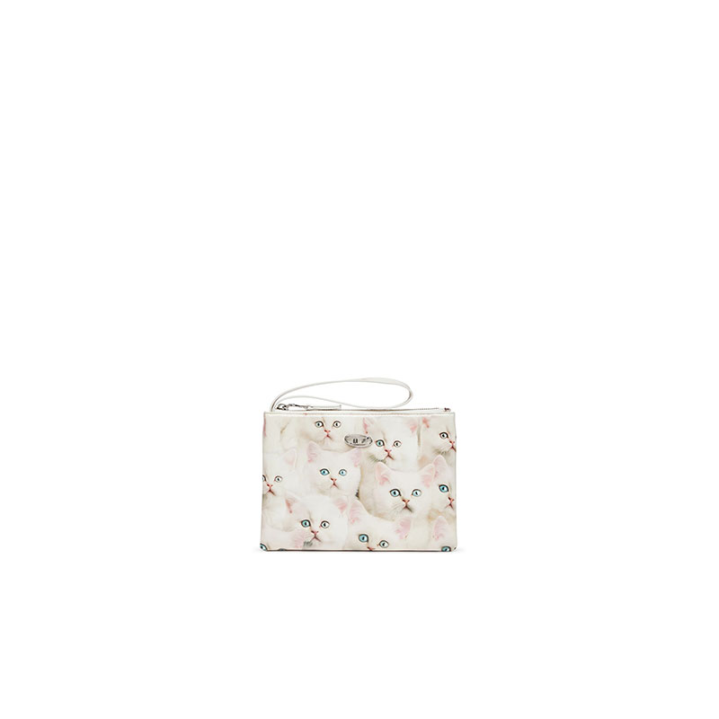 This women's pouch is built from glossy recycled PU that's printed all over with playful seasonal graphics. Detailed with a small metal Oval D, this slim design comes with a wrist strap and three internal card slots.