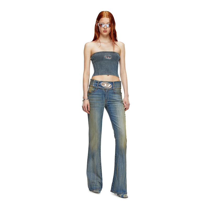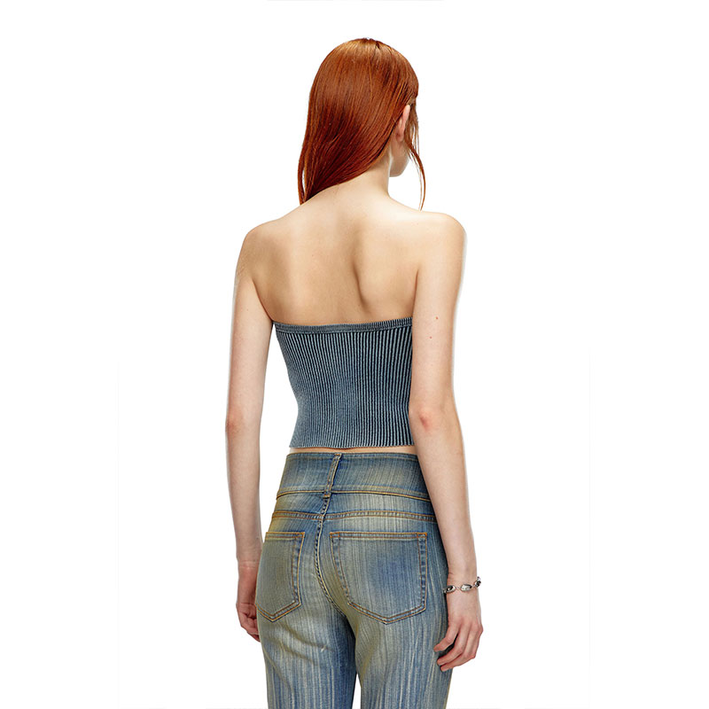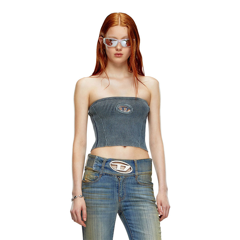 This women’s tube top channels Diesel’s denim DNA through the nuanced indigo blue hue. Rib-knitted using organic cotton mixed with stretch, it has a body-hugging fit and a metal Oval D plaque nestled in the chest cut-out.
