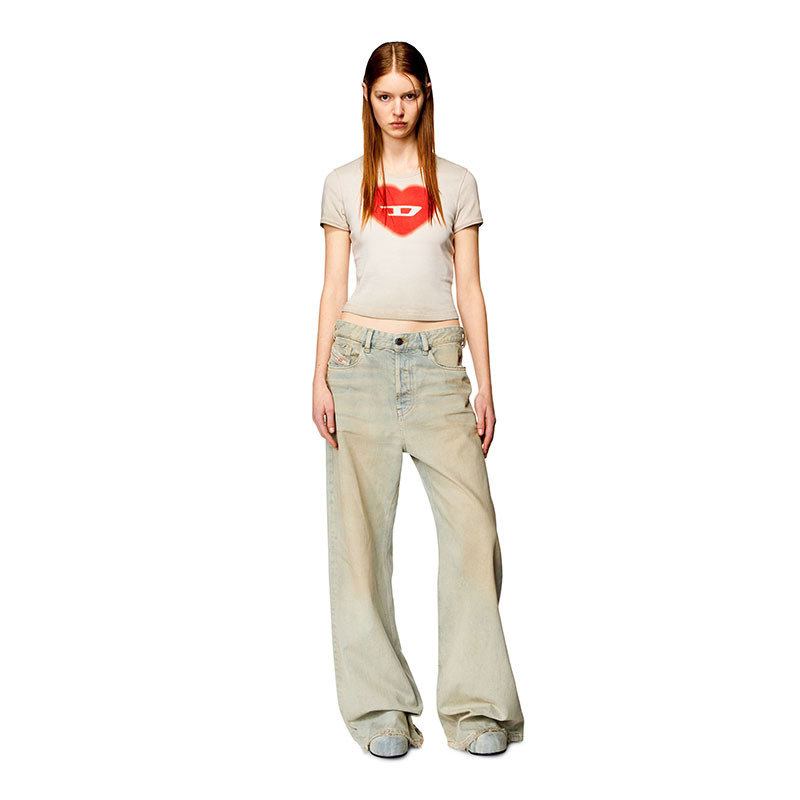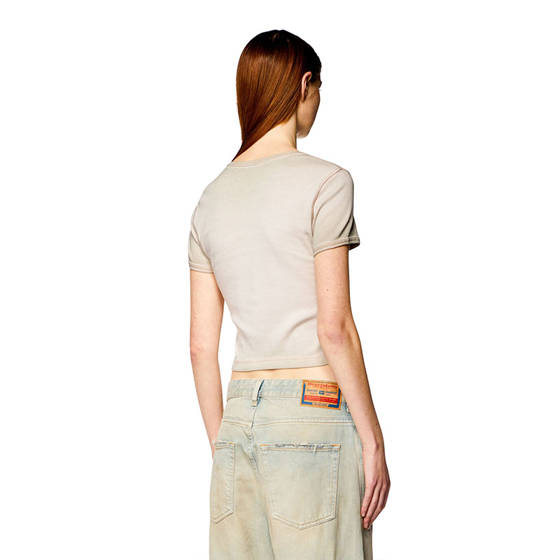 This women's tee is cut from stretch rib cotton that sits close to the body. The D heart logo is printed from the inside to create a watercolour effect. Pigment-dyed whilst inside out for a faded, worn-in look, its skinny silhouette is rounded off with contrast cover-stitching.