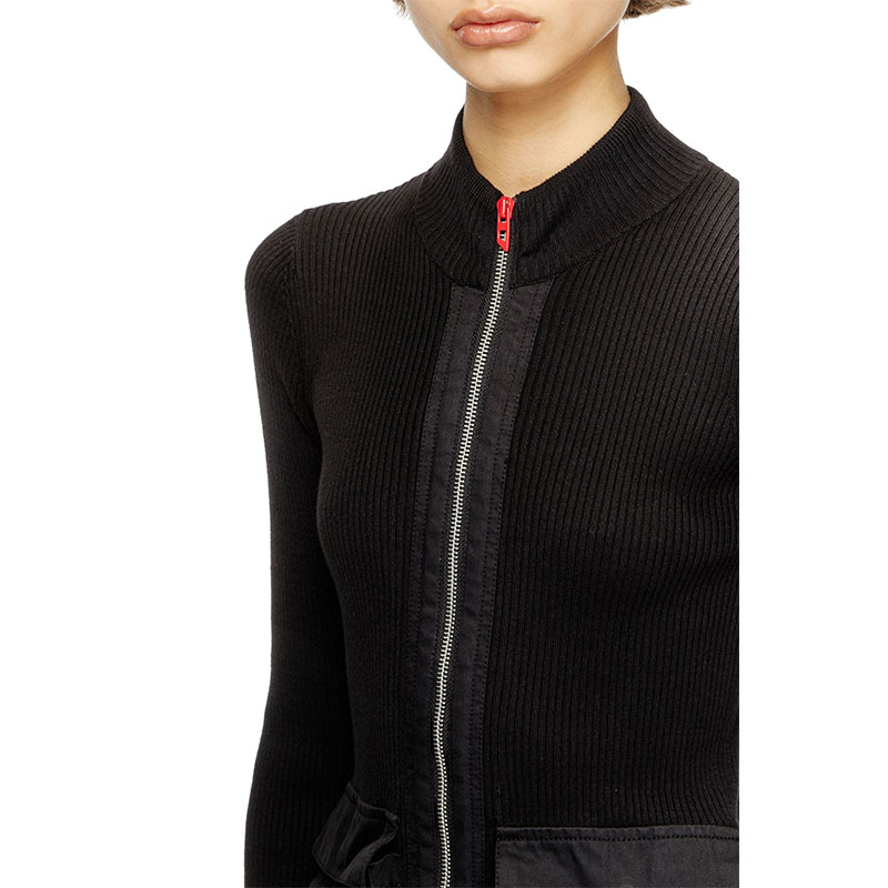 This black women's cardigan with long sleeves and high neck hugs the body in rib-knitted organic cotton. Its slinky silhouette is topped with smooth fabric cargo pockets and opens with a long zip. A red D puller adds a pop of colour.