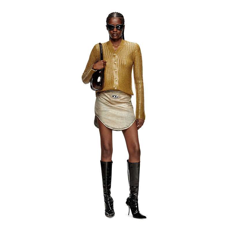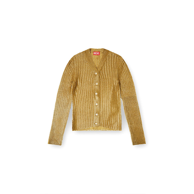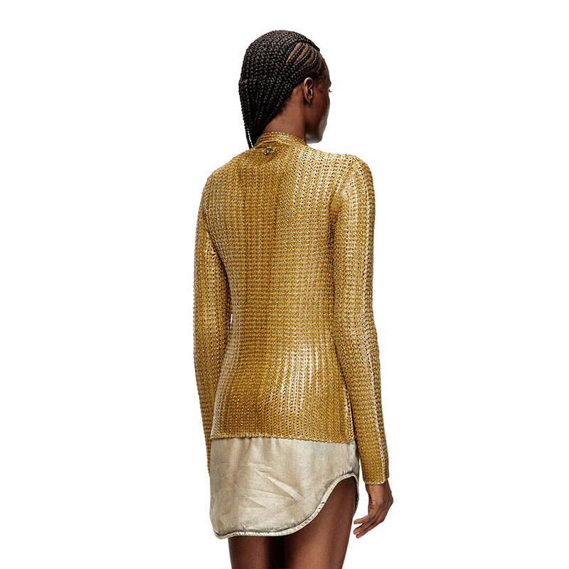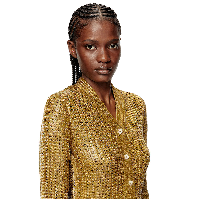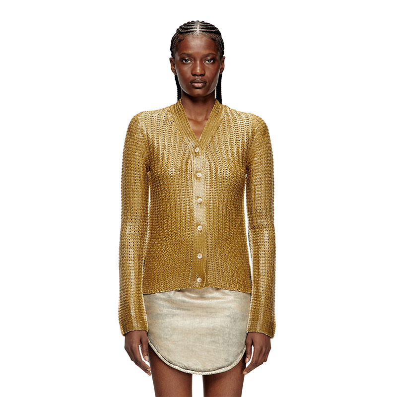 This women’s V-neck cardi fuses chunky ribbing with incredible luminosity. The knit is heat-pressed and finished in transparent Mylar foil, giving it a particularly shiny finish.