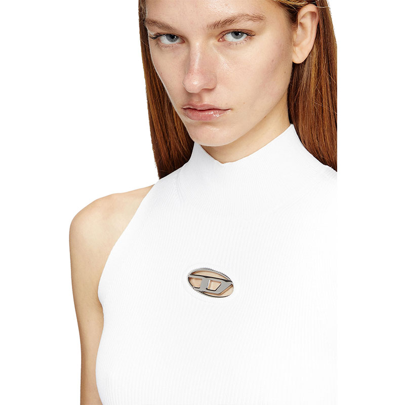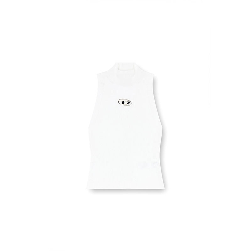 This women’s sleeveless top is made from flexible ribbed knit for a snug, body-contouring fit. Designed with a turtleneck and slightly cropped, it features an updated interpretation of the Oval D logo – a metal plaque is inserted in the chest cut-out, revealing subtle peeks of skin.