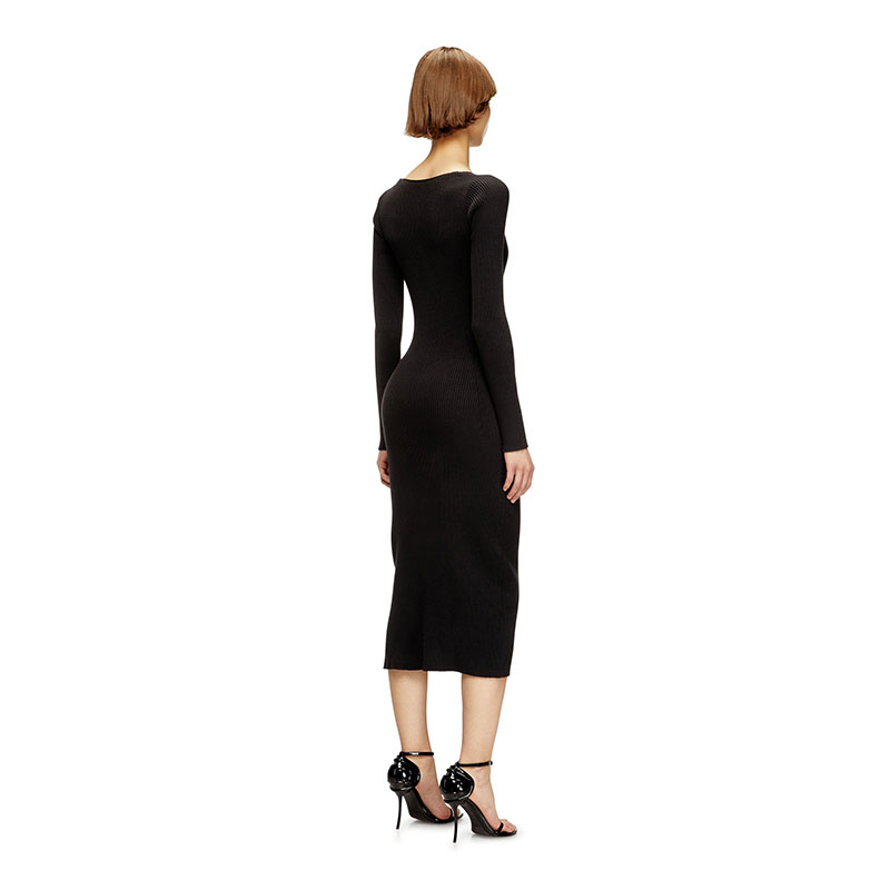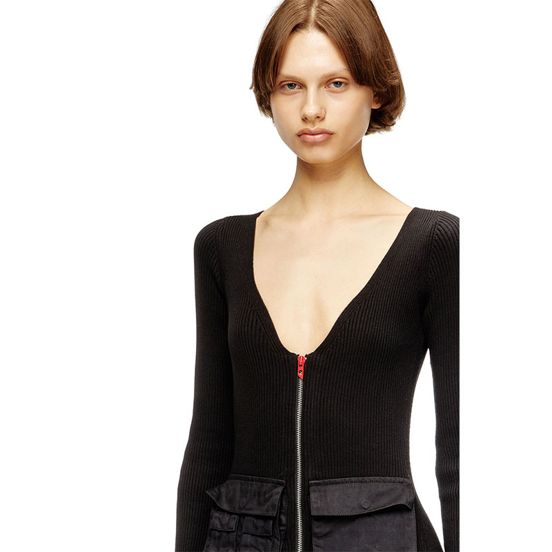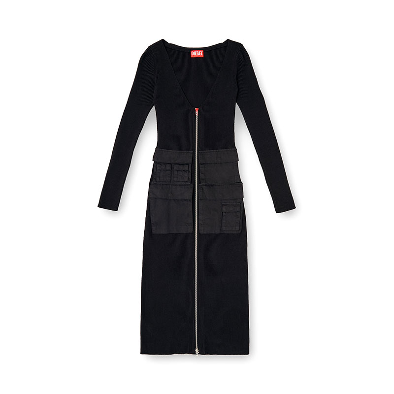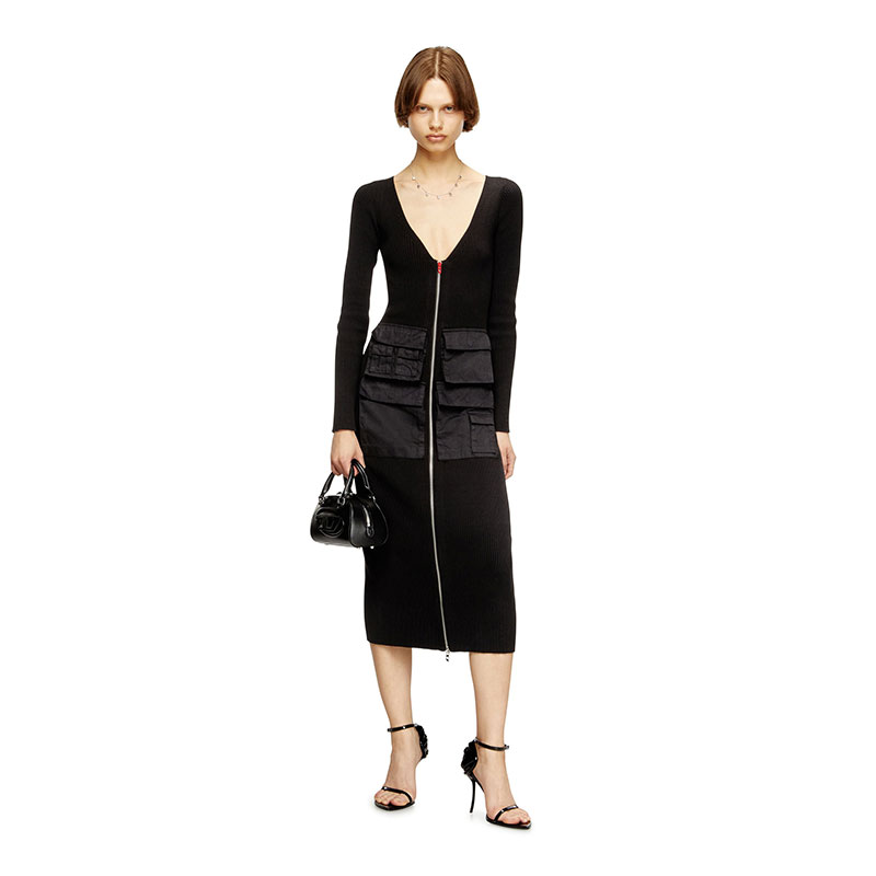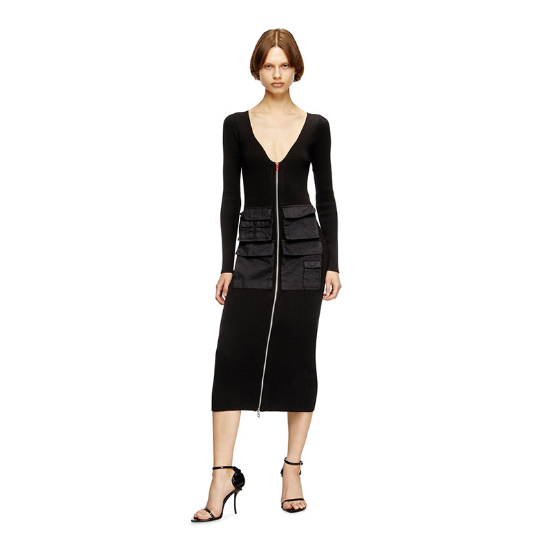 This women's knit long-sleeve dress has a full two-way zip closure with lacquered red D puller. Topped with cargo pockets, it’s made from close-fitting ribbed organic cotton and falls to a midi length.