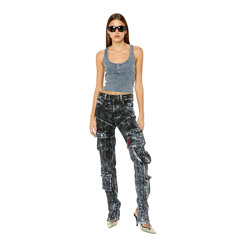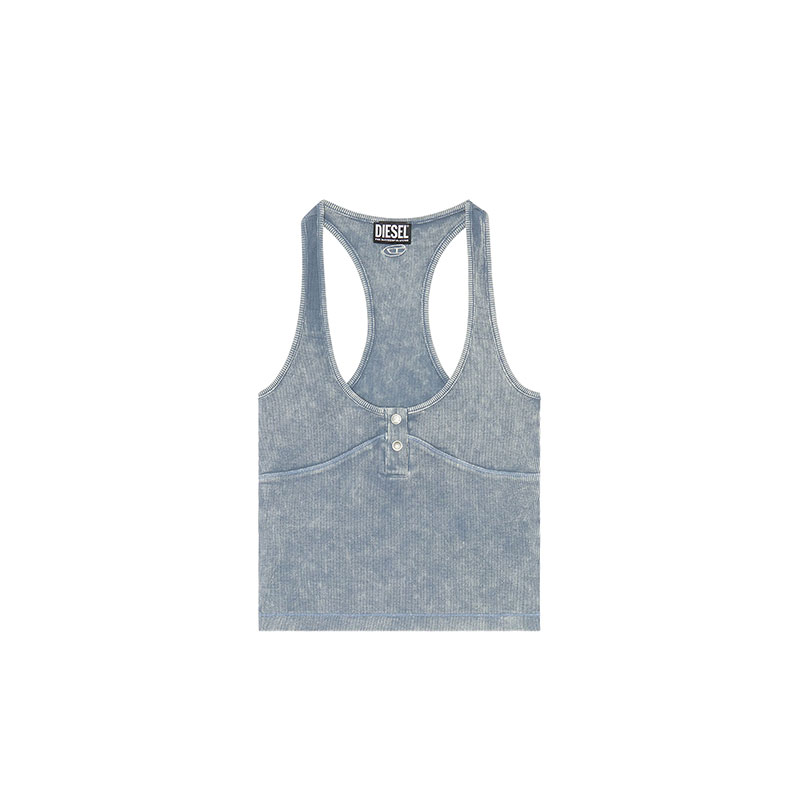 This slim-fit racerback top is cut from ribbed stretch cotton, garment dyed and washed for a faded look. A double snap button Henley opening and embroidered oval 'D' logo on the back complete this women's style.