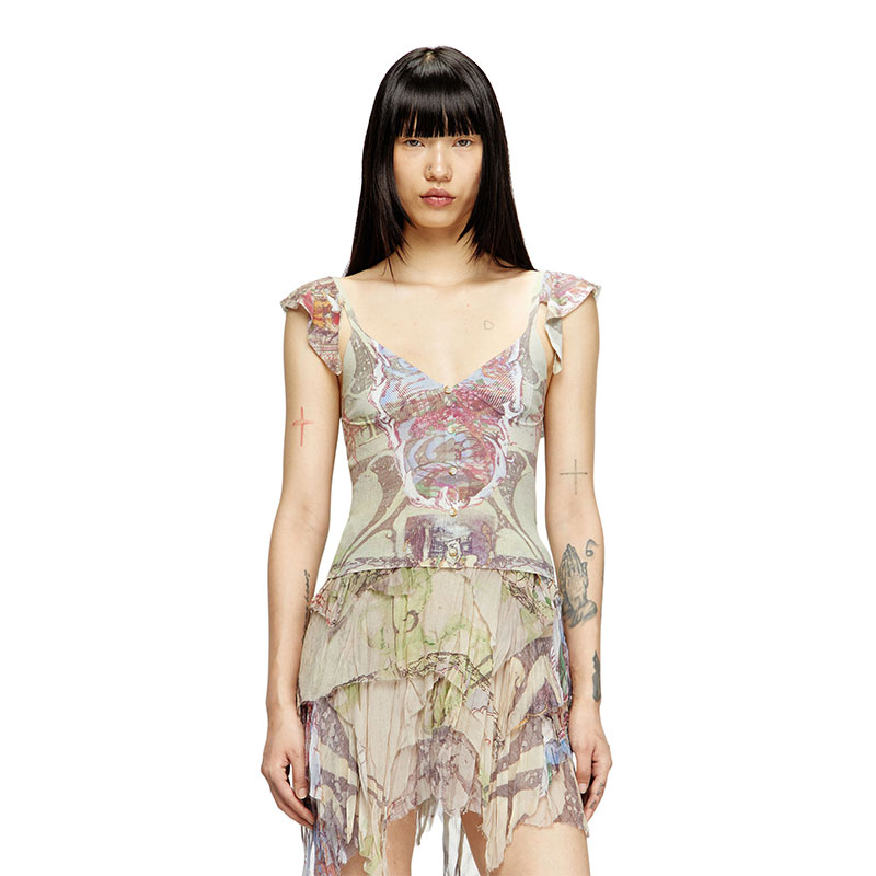 Created in collaboration with an artist, this women’s crop top is a fine ribbed cotton-blend knit printed all-over with medieval-inspired artwork. Trimmed with fluttery ruffles at the shoulder straps, the silhouette features a V-neck and buttons down the front.