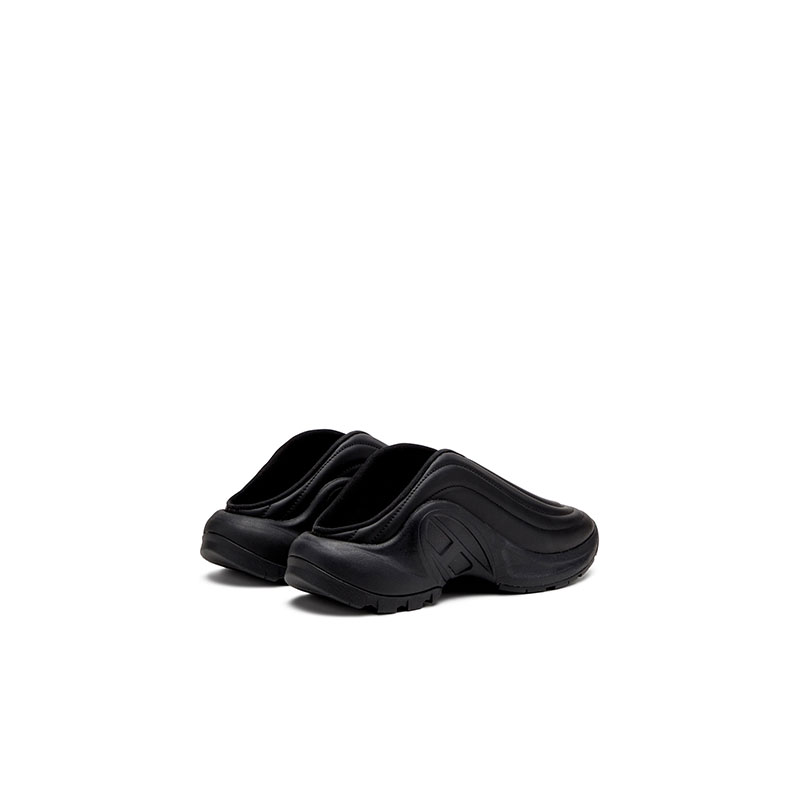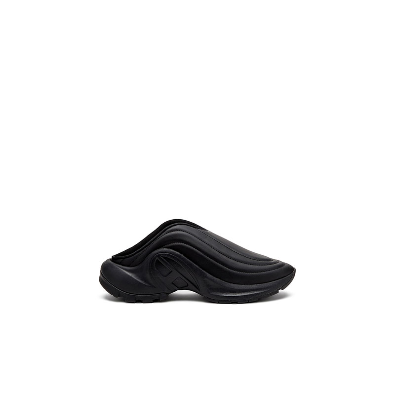 A sleek, monochrome take on a sculptural silhouette, these unisex mules reimagine the iconic S-D-RUNNER-X sneaker. The curve of the hand-treated matte upper, made from soft PU, is echoed in the meticulous stitching, as well as the sole – note the embossed Oval D branding wrapping beneath it.