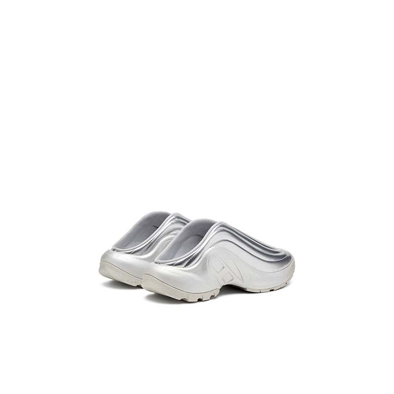 A mule iteration of the S-D-RUNNER-X sneaker, these genderless shoes combine a sculptural silhouette with a futuristic shine of metallic silver. The curve of the soft, slip-on upper is echoed in the meticulous stitching, complemented by an exaggerated sole that’s embossed with a folded-effect Oval D logo.