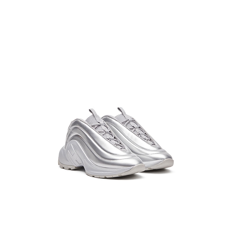 Designed for all genders, this shiny ridged trainer flaunts a statement arched silhouette. Its slip-on design features a mesh tongue insert with elasticated cross-cross laces. Set on a rubber running sole with an Oval D wrapping around the instep.
