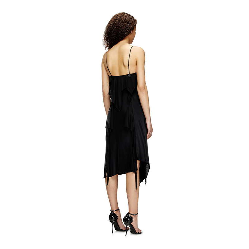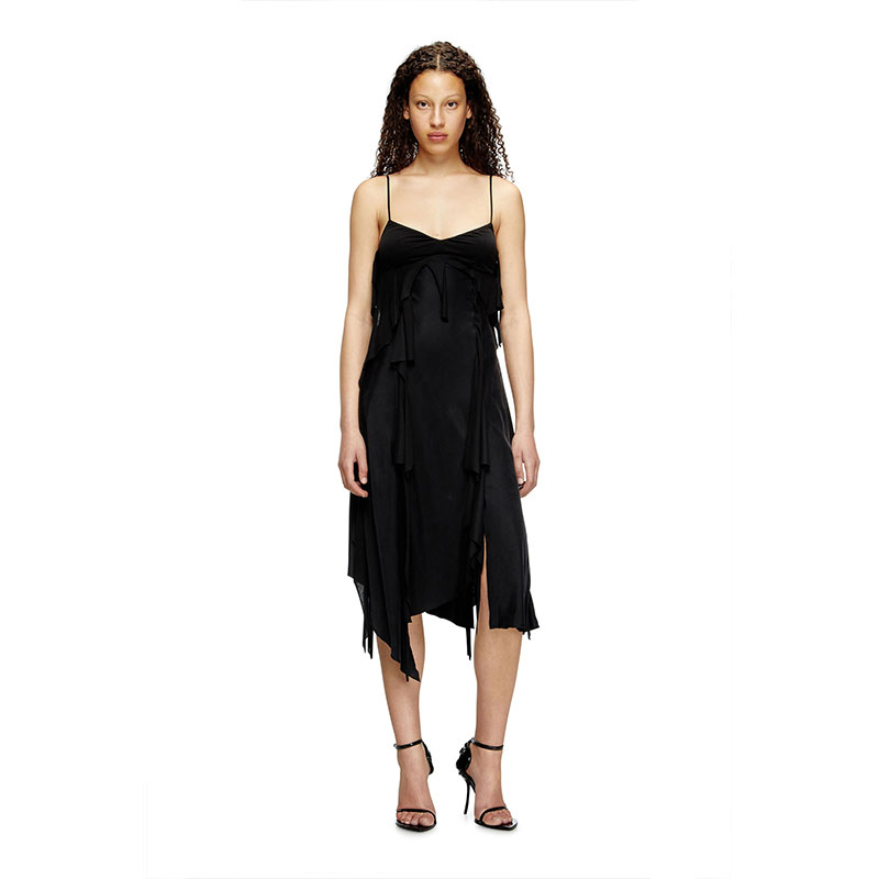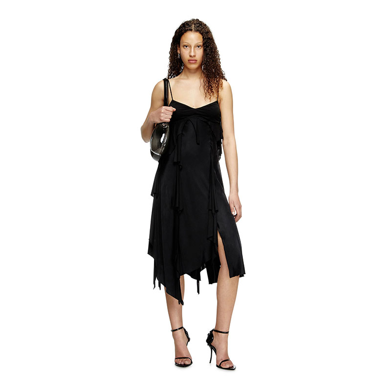 This black satin midi dress is built with raw-cut jersey flounces for a tattered take on a fluid slip style. Its slim, asymmetrical silhouette features a metal Oval D plaque hanging down from the right spaghetti strap.