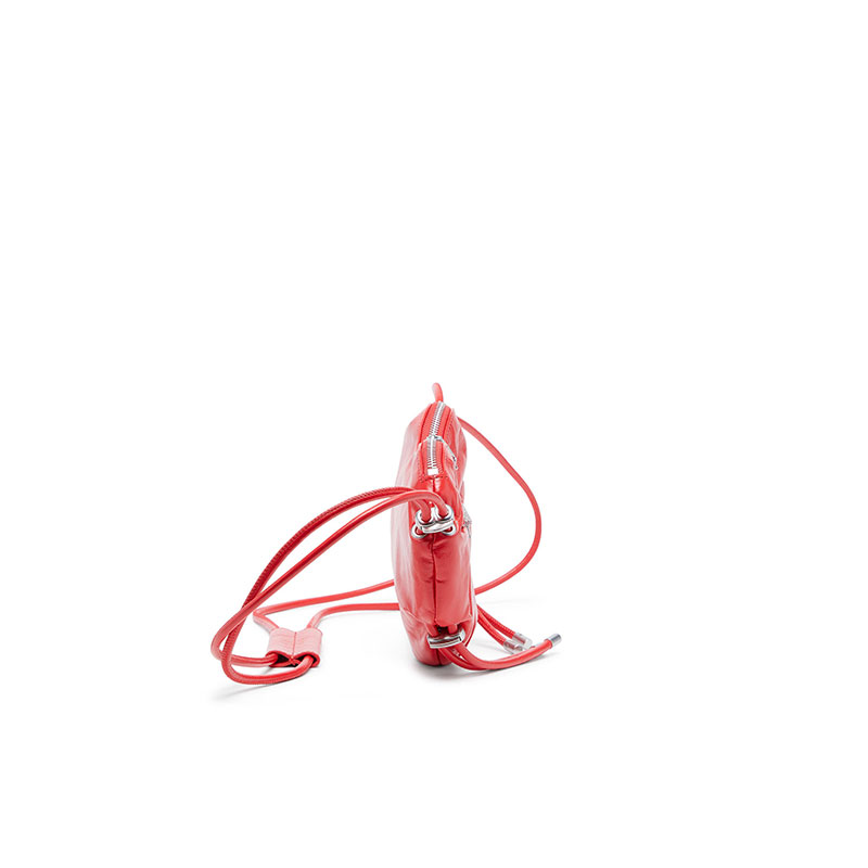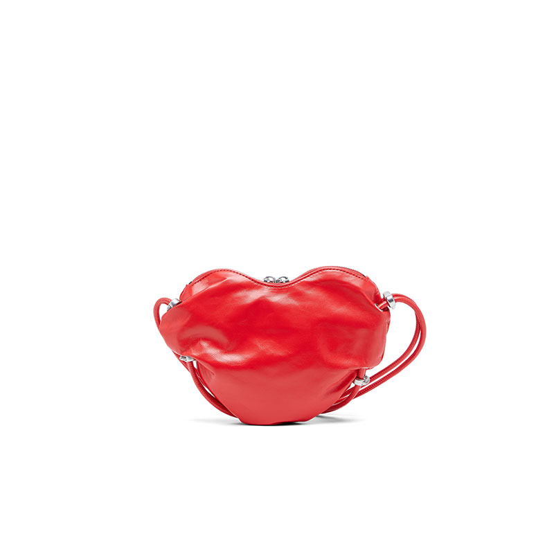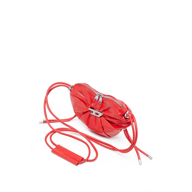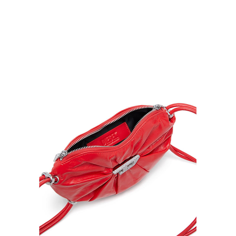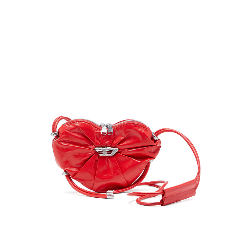 This women’s shoulder bag is crafted from responsibly sourced leather with a shiny, wrinkled finish reminiscent of athletic tracksuits. The silhouette is artfully crushed, shaped like a heart – Diesel’s Valentine’s Day statement. At the centre, the iconic D is pavé-set with crystals and backed by a mirror for captivating depth. A twin drawstring strap, elevated with sleek hardware, seals the look with a luxe sportswear touch.
