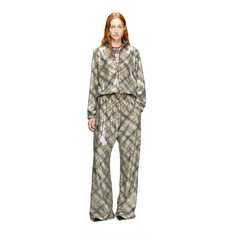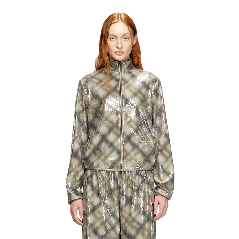 Women's regular-fit turtleneck sweater, crafted from a comfortable nylon-elastane blend in a warp knit, finished with ribbed highlights. It showcases an all-over transparent sequin application that illuminates the underlying check pattern. Practical details such as invisible zippers in the pockets and a center front zip make it as practical as it is stylish. The metal Oval D plaque is positioned at the back, adding a signature Diesel touch.