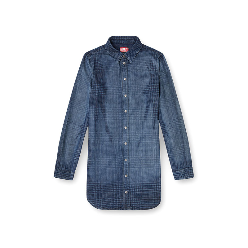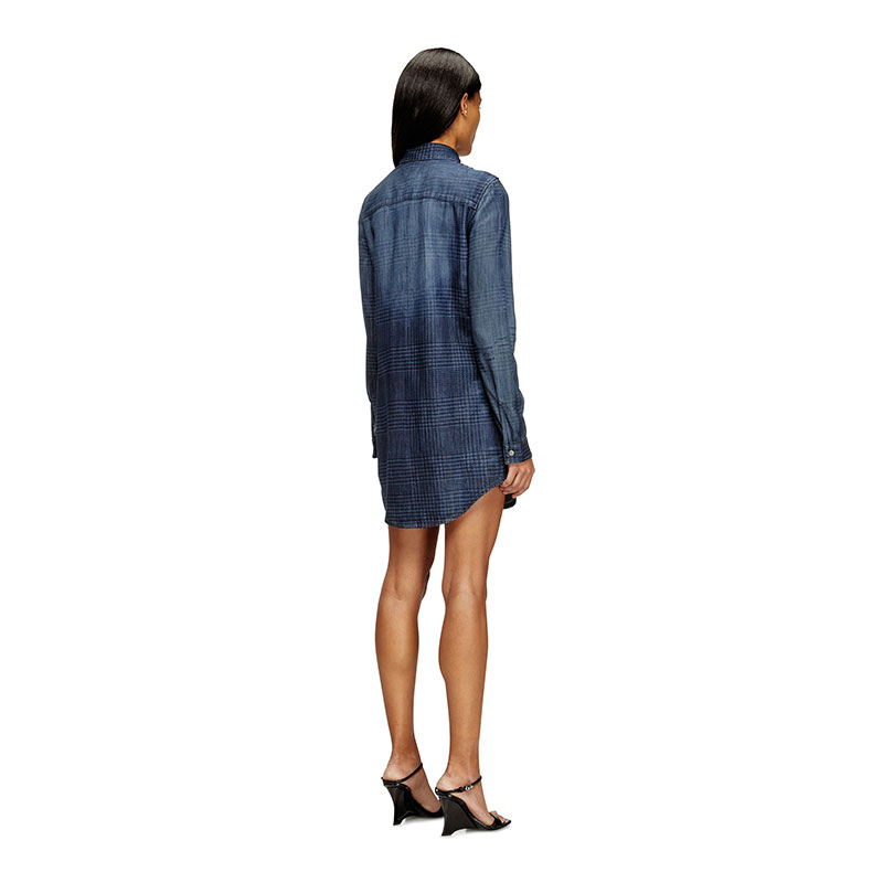 This women's knee-length dress is cut to a sleek shirt silhouette, with a pointed collar and branded metal buttons.Crafted from organic cotton and TENCEL Lyocell for a fluid feel, this medium blue fix denim nods to traditional tailoring, while keeping true to Diesel's DNA. A subtle Prince of Wales pattern is meticulously traced onto the fabric using multiple laser passes, while whiskering and stonewash effects underpin the iconic jeans aesthetic.