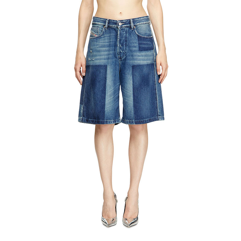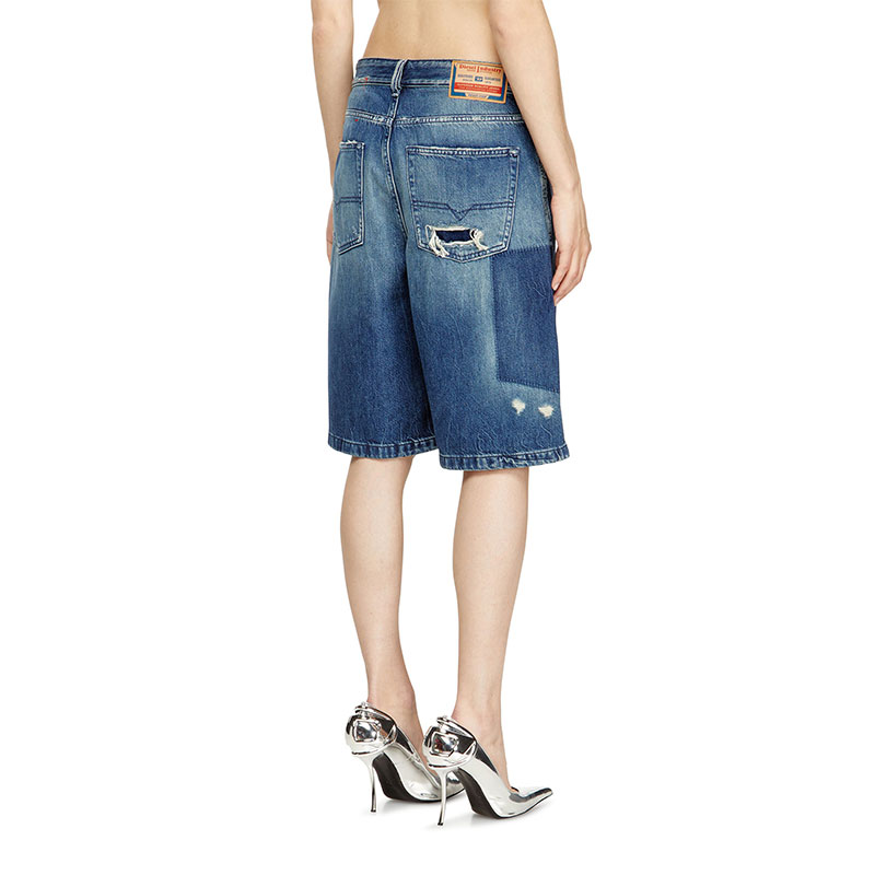 Women's denim five-pocket shorts with a relaxed-leg, knee-length fit.