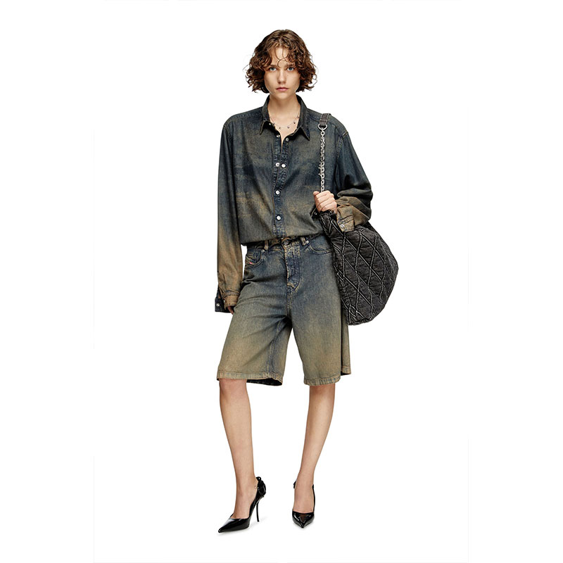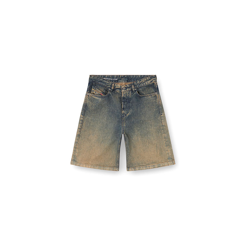 Women's denim five-pocket shorts with a relaxed-leg, knee-length fit. Crafted from lightweight TENCEL Lyocell denim with a fluid texture, it features a blue wash is treated with spray and laser techniques to create a dégradé finish on the hem, enhanced by dirt effects in sandy tones.