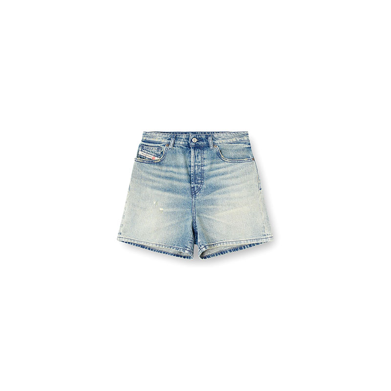 Women's denim five-pocket shorts cut to mid thigh, with a straight fit and medium waist.