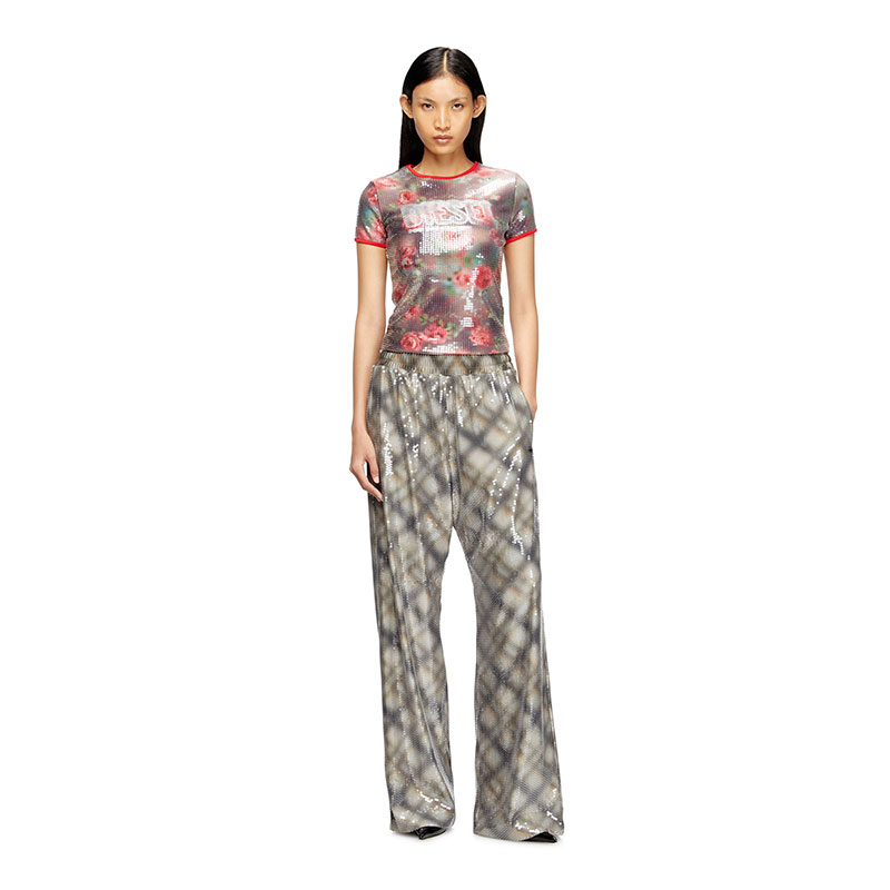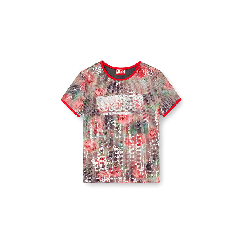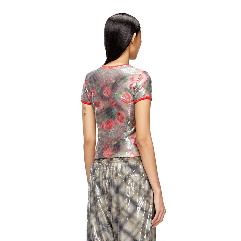 Crew neck short-sleeved top with a skinny fit. Made from stretch nylon, it features a digital all-over floral print, with transparent sequins covering the entire surface, adding brightness and a contemporary touch. The front showcases a slightly blurred, metallic Diesel logo in Mylar. Finished with solid color trims on the collar and sleeves.