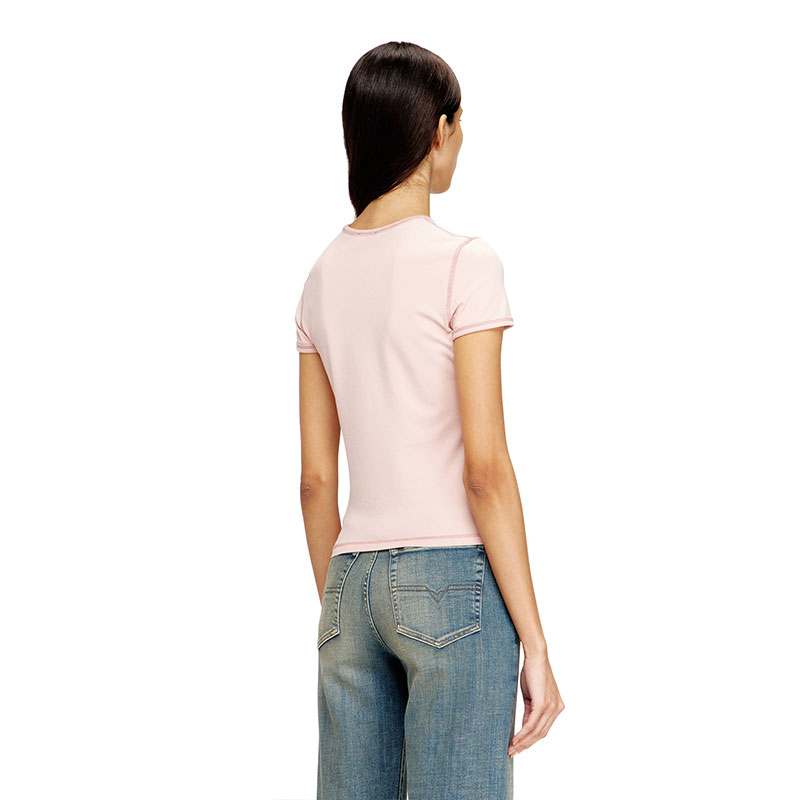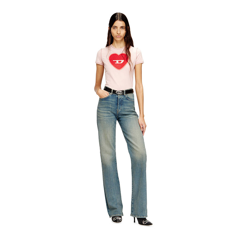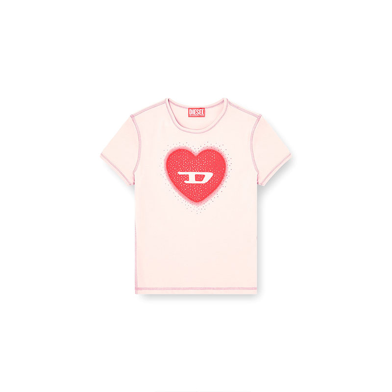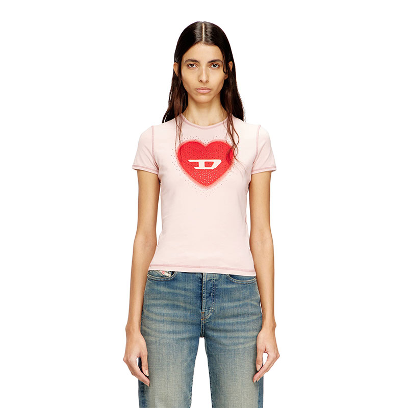 Slim-fit women's T-shirt with crew neck and short sleeves, made from stretch jersey in organic cotton. The tee features a heart-shaped digital print with a D logo and studs on the front. Tonal cover stitching completes the clean design.