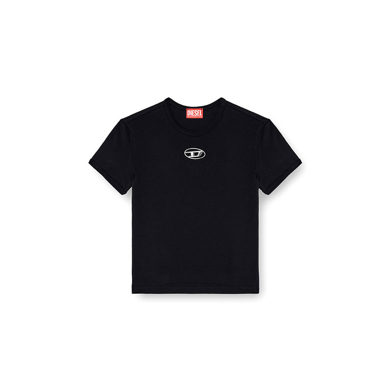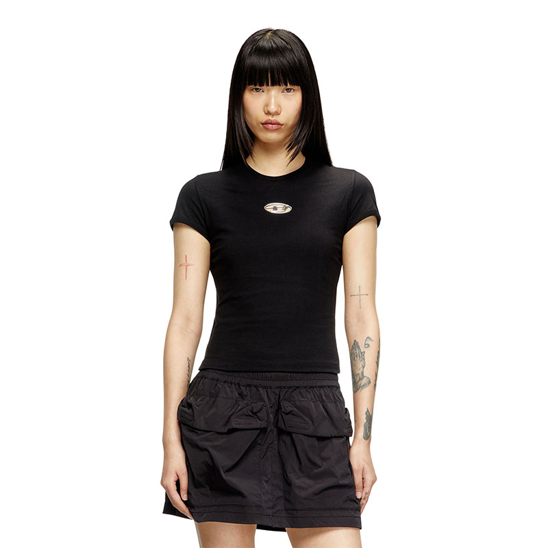 Cut from organic jersey cotton, this women's crew neck T-shirt features a slim silhouette with ribbed trims. The metallic Oval D cut out at the centre of the chest is a signature detail.