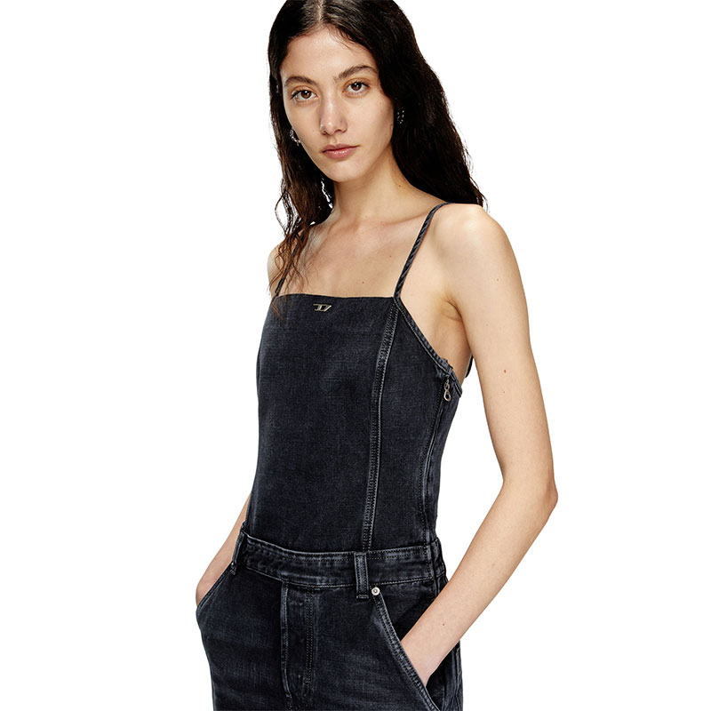 This women’s denim jumpsuit features a fitted, strappy top and a loose fit through the leg. The bottom is detailed with workwear inspired pockets, while a metal D logo plaque hallmarks the chest.