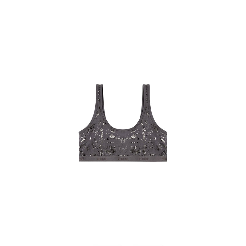 This bralette, crafted from a cotton and elastane blend, features a laminated all-over print that looks intentionally worn and scraped off. The supportive elastic band is adorned with the Diesel logo in the same metallic tones.