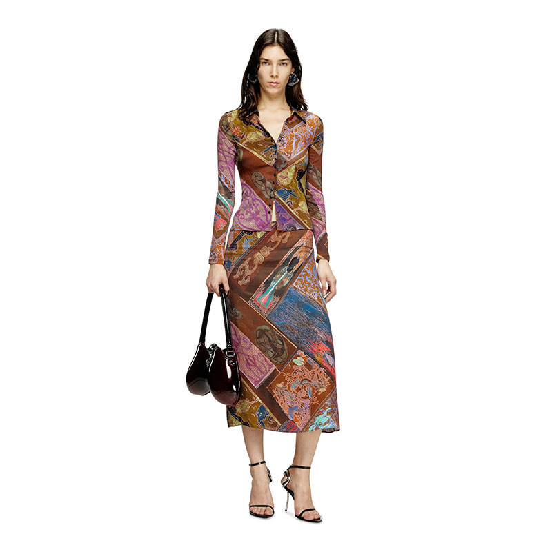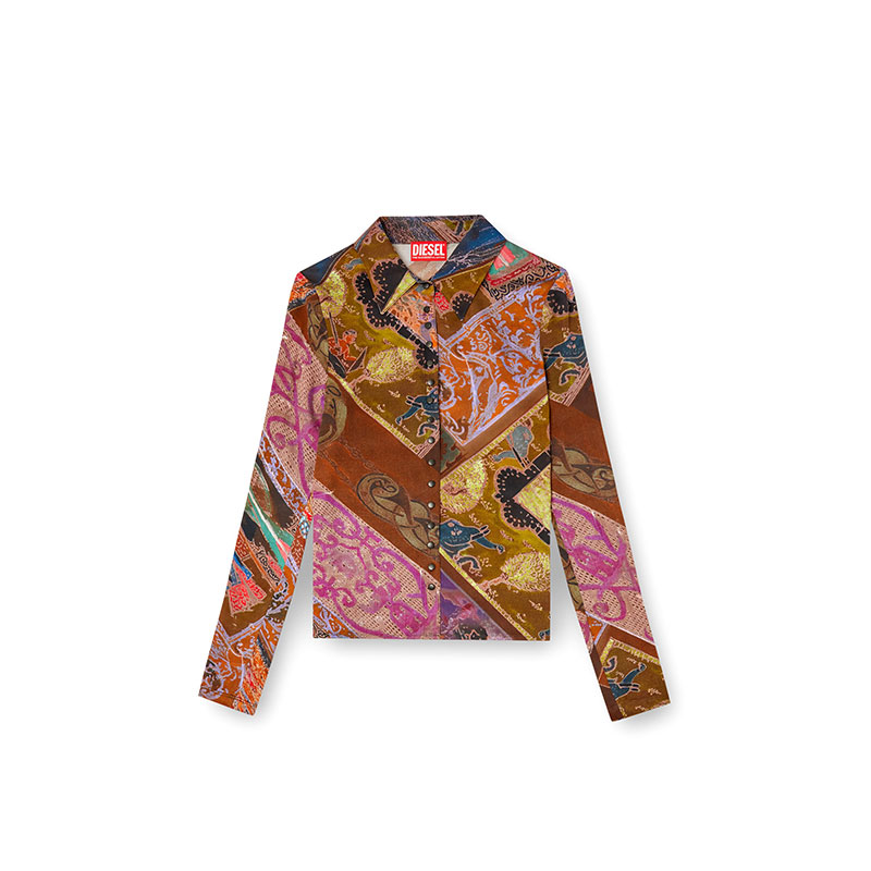 This women’s shirt sculpts the body with a slim silhouette. Cut from soft stretch fabric containing responsibly-sourced viscose fibres, it fastens with snaps and has a metal Oval D charm on the back. The colourful printed artwork is an artistic interpretation of medieval heraldic tiles.