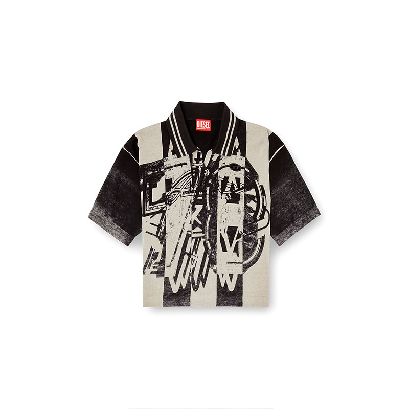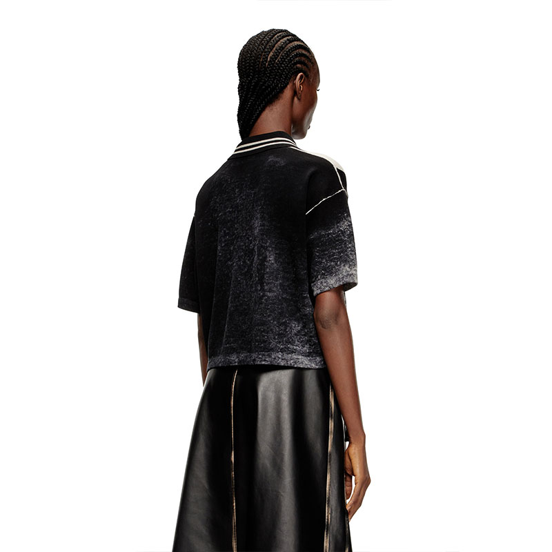 This women's black striped short-sleeve polo jumper riffs off football jerseys. The contemporary 78 logo is printed from the inside for a worn look, topped with Diesel Industry lettering on the outside. Built for a regular fit from organic cotton.