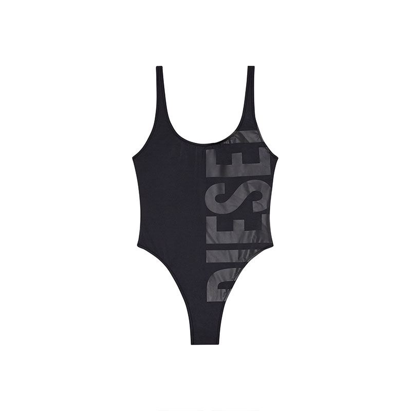 This women's bathing suit is printed with a maxi Diesel logo down the left side, cut off at the edges to form a streamlined high-leg silhouette. It's made from recycled stretch fabric and styled with a classic low-cut back.