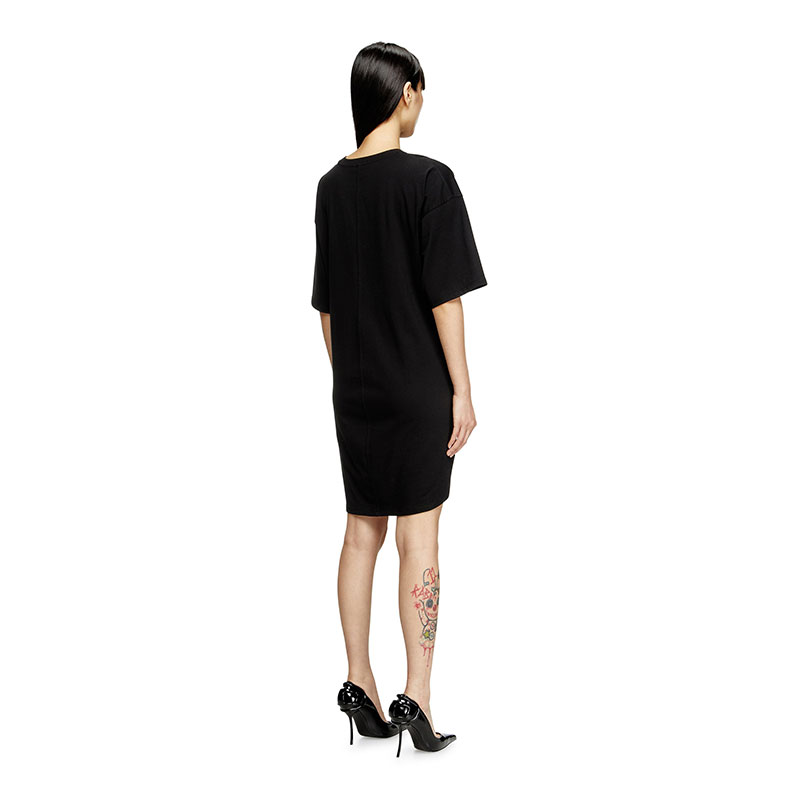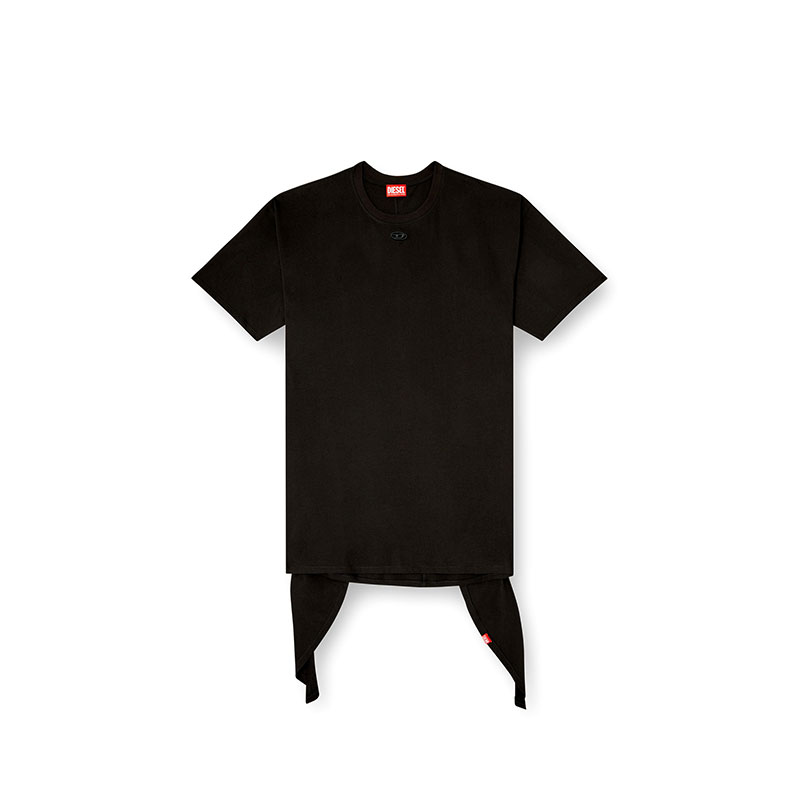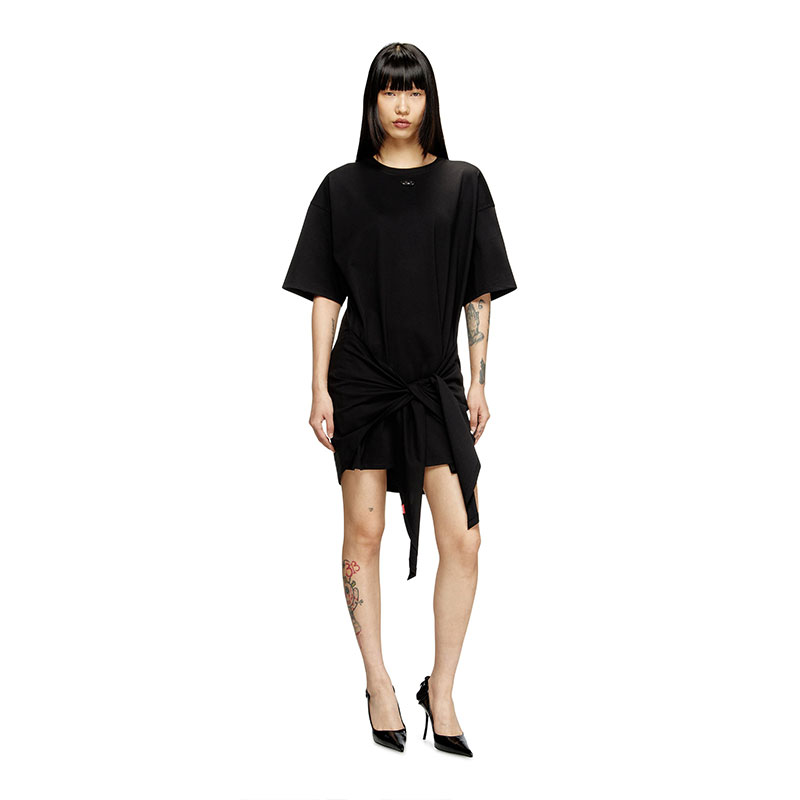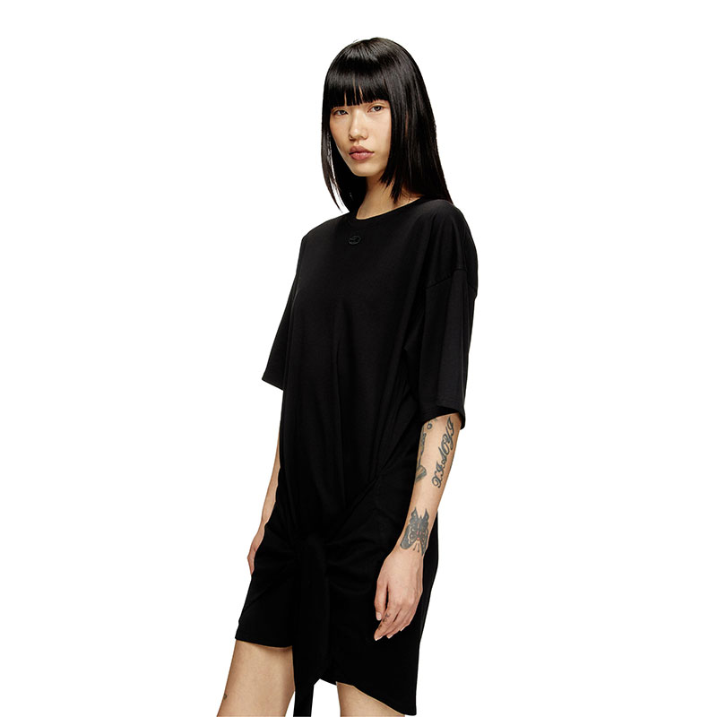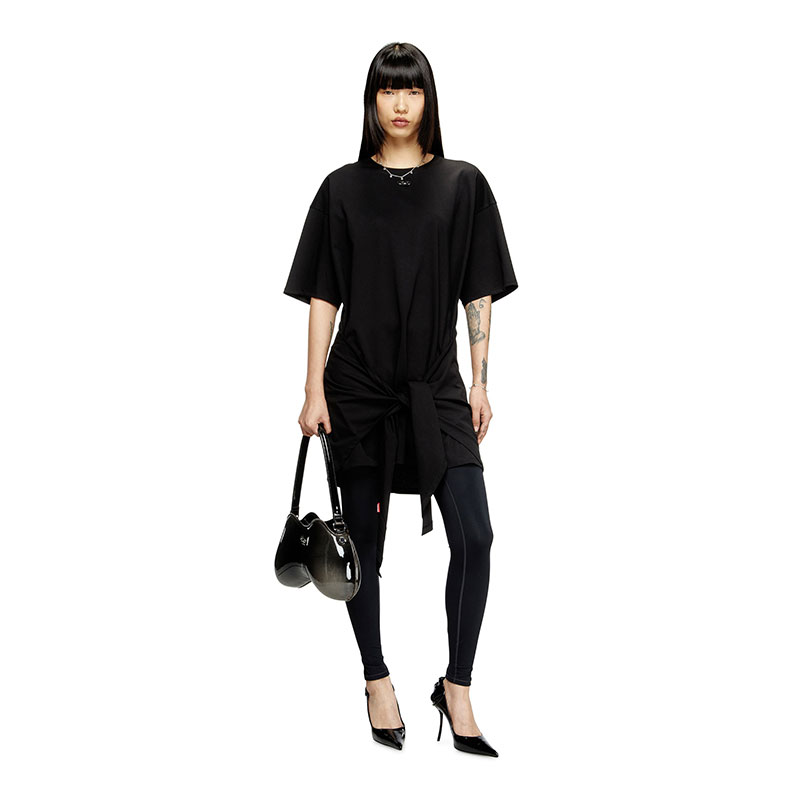 This women's T-shirt dress is made from organic cotton jersey. Its regular silhouette features dropped sleeves and front overlays that tie bandana-style in a draped effect. An embroidered Oval D cut-out on the front reveals a hint of skin.