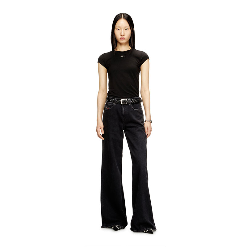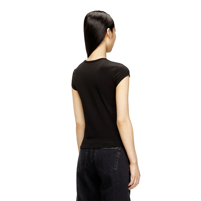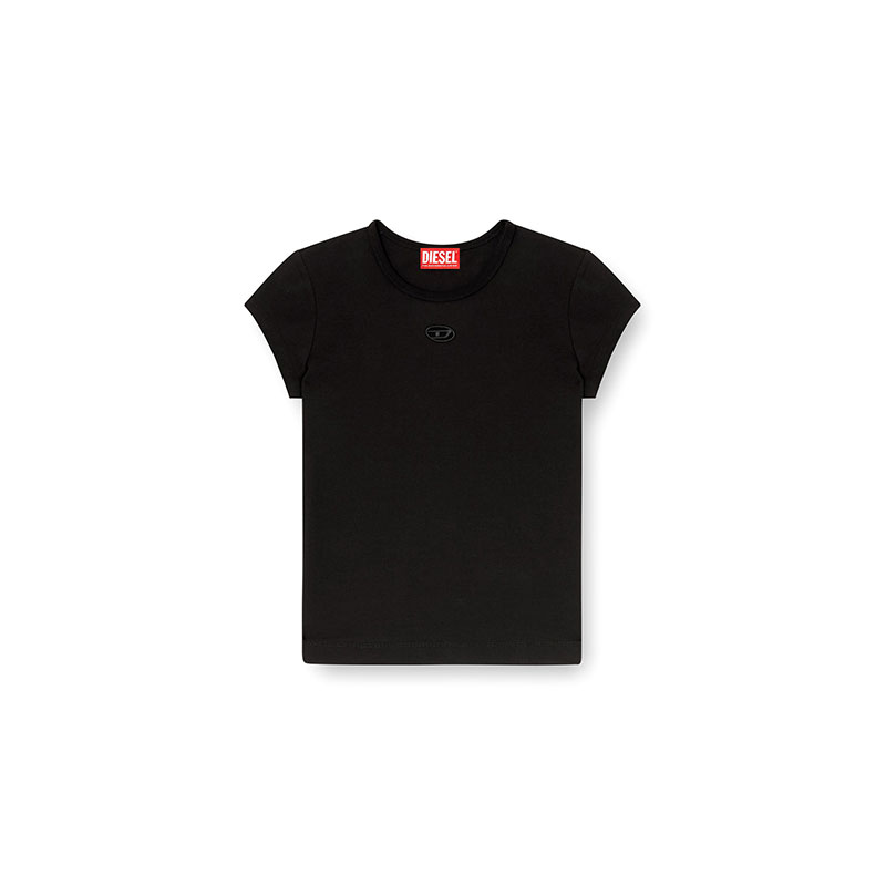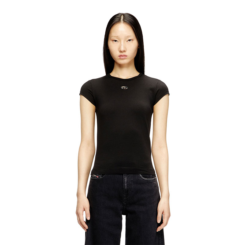 Women’s close-fitting top in a clean, essential cut, crafted from organic cotton with added stretch. A laser-cut and embroidered Oval D logo decorates the front, revealing a glimpse of skin or the layer below.