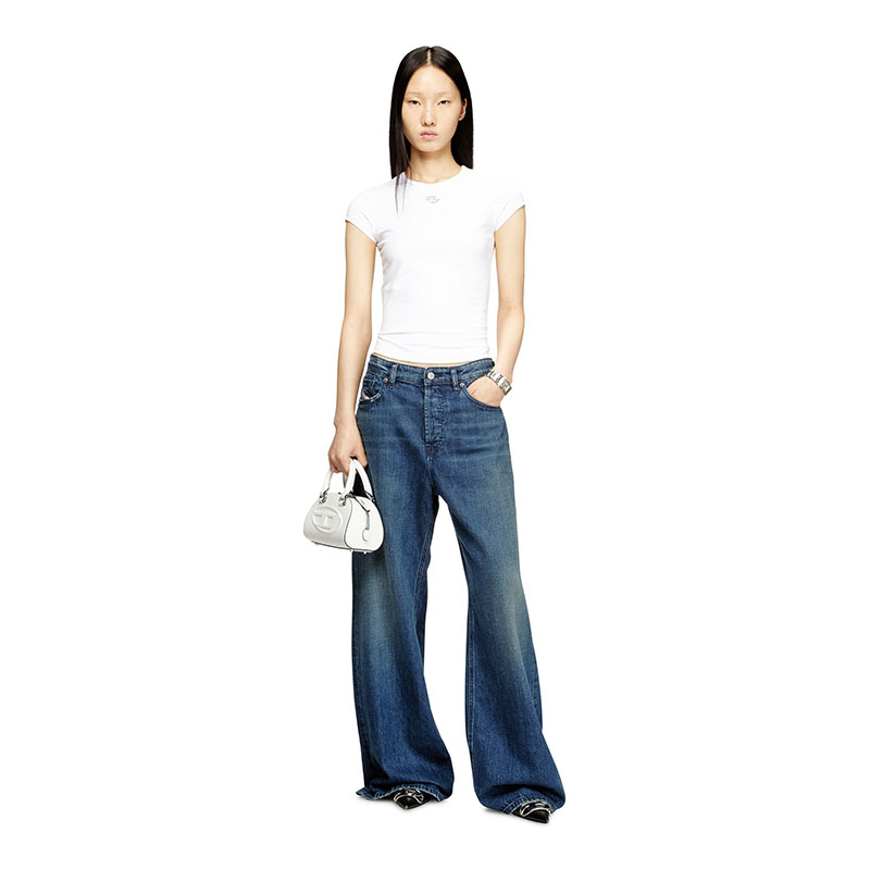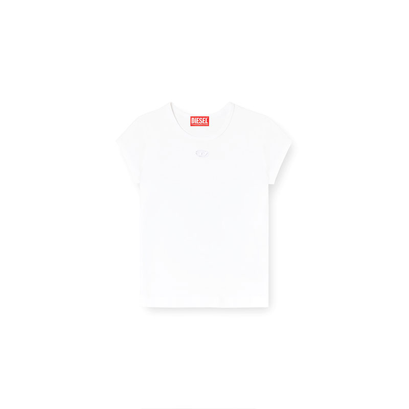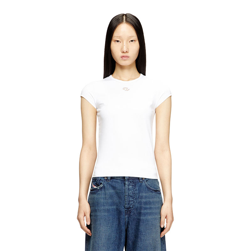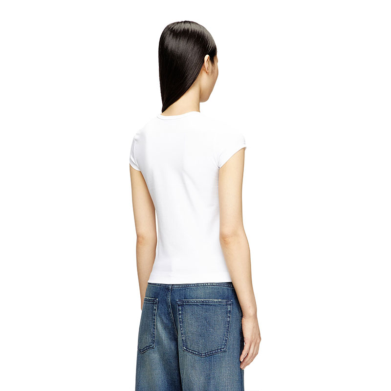 Women’s close-fitting top in a clean, essential cut, crafted from organic cotton with added stretch. A laser-cut and embroidered Oval D logo decorates the front, revealing a glimpse of skin or the layer below.