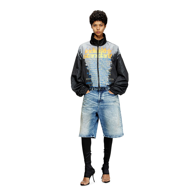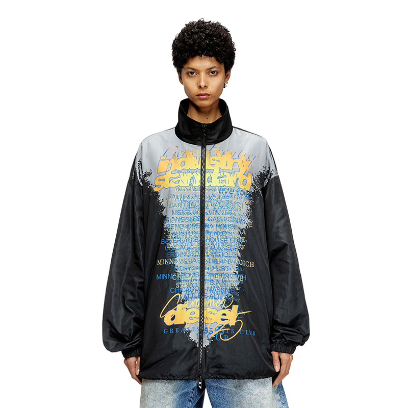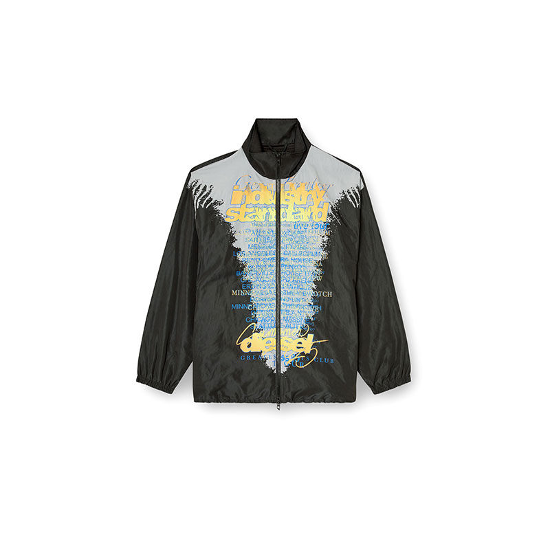 Men's Remaster jacket made from lightweight technical fabric, featuring a high neck, elasticated trims and a drawstring at the hem. Through the Remaster capsule, Diesel and NTS spotlight DJs who have shaped global music culture, fusing fashion with personal storytelling. Each DJ selects a garment to imprint with lyrics or a meaningful quote, merging fashion with the underground club scene.