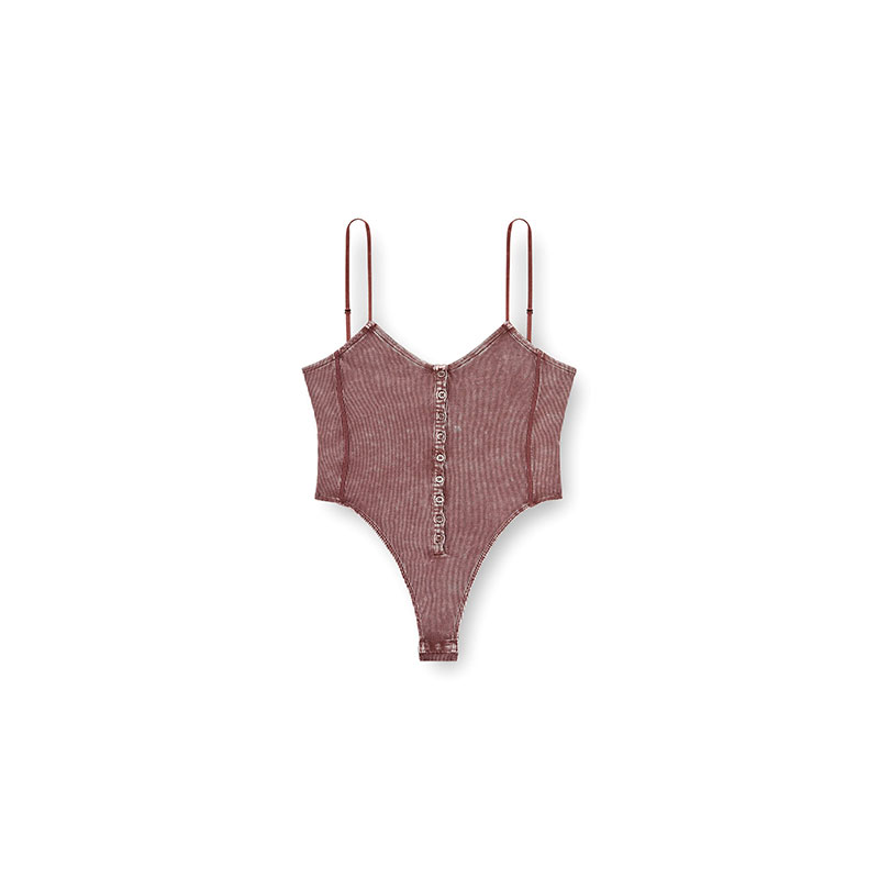 Women’s thong bodysuit in flexible ribbed jersey. Made from a blend of ECOVERO viscose and stretch, this style features adjustable spaghetti straps, buttons at the front and a cool marled fade for a lived-in effect. An embroidered Oval D logo hallmarks the back.