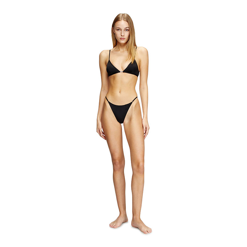 Women's black thong cut from soft stretch nylon. Its barely-there silhouette is elevated with a metal Oval D plaque on the back.