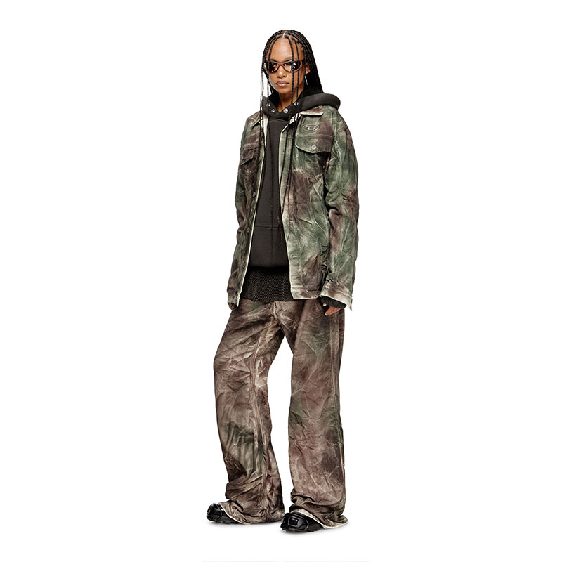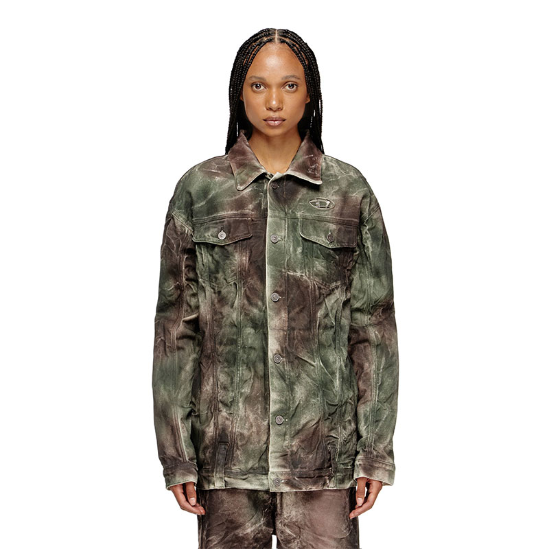 Diesel joins forces with Thug Club — a Seoul-born, now-global fashion label forged in the city’s youth underground and rooted in hip-hop, moto grit and Itaewon energy. From an eight-piece capsule alive with subversion and streetwear charge, this unisex trucker jacket features a grey-and-green abstract pattern, remixed with a hand-sprayed fade and battle-tested crinkled texture. The silhouette is relaxed, cut from hard-wearing cotton canvas. At the chest, the brands’ insignias fuse, broadcasting the partnership outright.