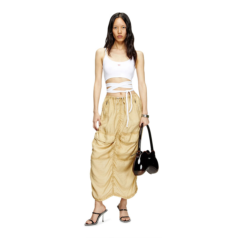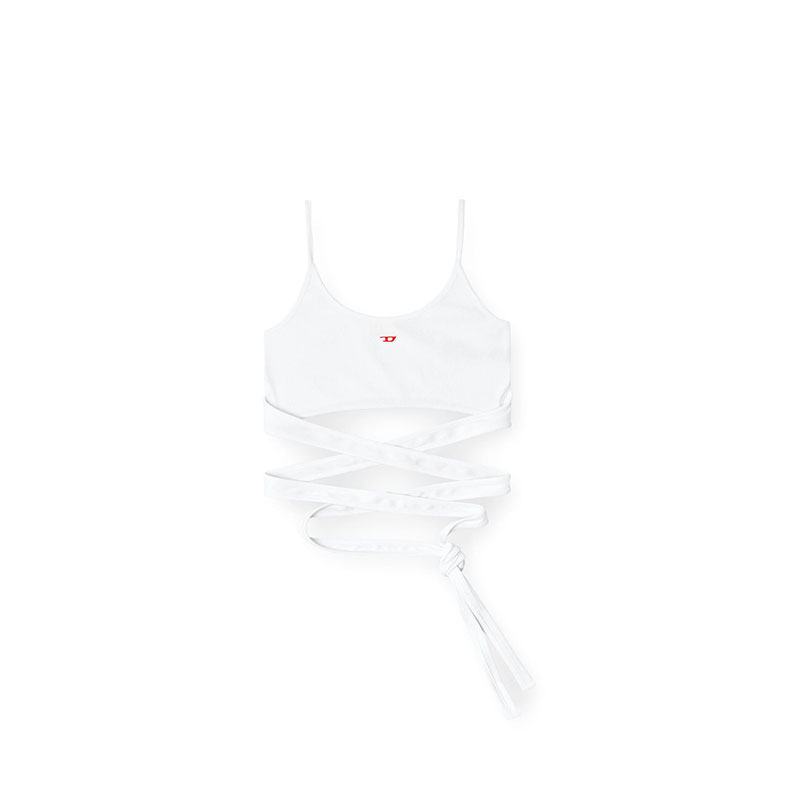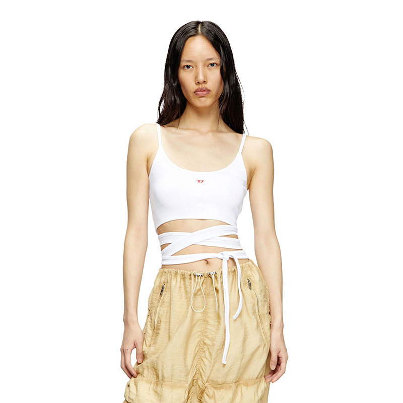 This women's white vest top sits close to the body in stretch-rib organic cotton. The lower half is broken up into straps that criss-cross around the body and tie in a knot. Detailed with a tiny embroidered D patch on the chest.