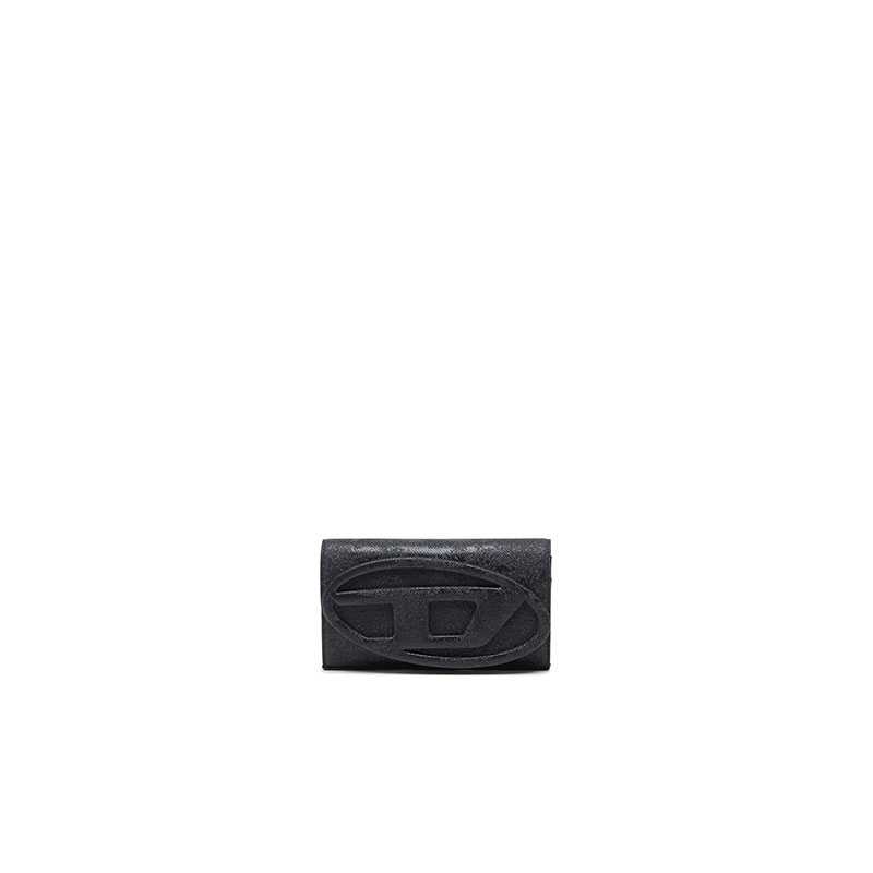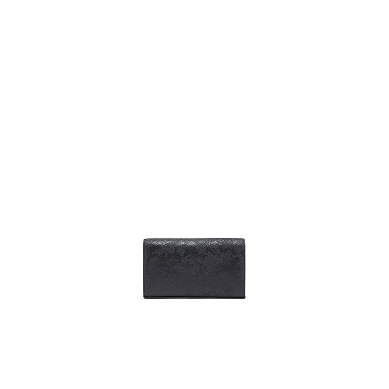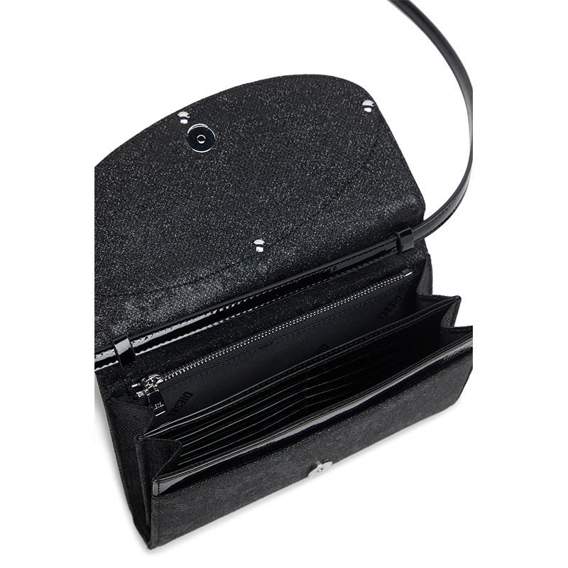 Shine and shimmer mix with subtle utilitarian vibes in this women’s large wallet. Doubling as a clutch or a mini shoulder bag thanks to the optional strap, it’s crafted from black Lurex with a textural-glitter camouflage print and glossy trims. The fabric-covered Oval D plaque seamlessly complements the tonal yet beautifully rich design. The gusseted interior is fitted with card slots, a note compartment and a secure zipped pocket for coins.