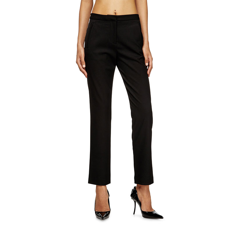 High-waisted tapered pants featuring a front closure with a hidden zip and metal hook. Made from stretch wool, they offer optimal comfort. They have front welt pockets and Oval D metal details under the left pocket.