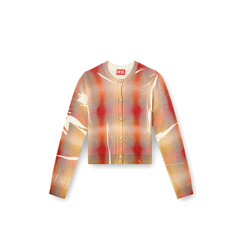 This women’s fine-knit cardigan channels the silhouette of a ladylike jacket. Spun from responsibly sourced wool, it’s printed all-over with a distorted interpretation of checks – that pattern is softly blurred and spliced with streaks of white for a creased effect. Note the prominent silver buttons and neat ribbed trims.