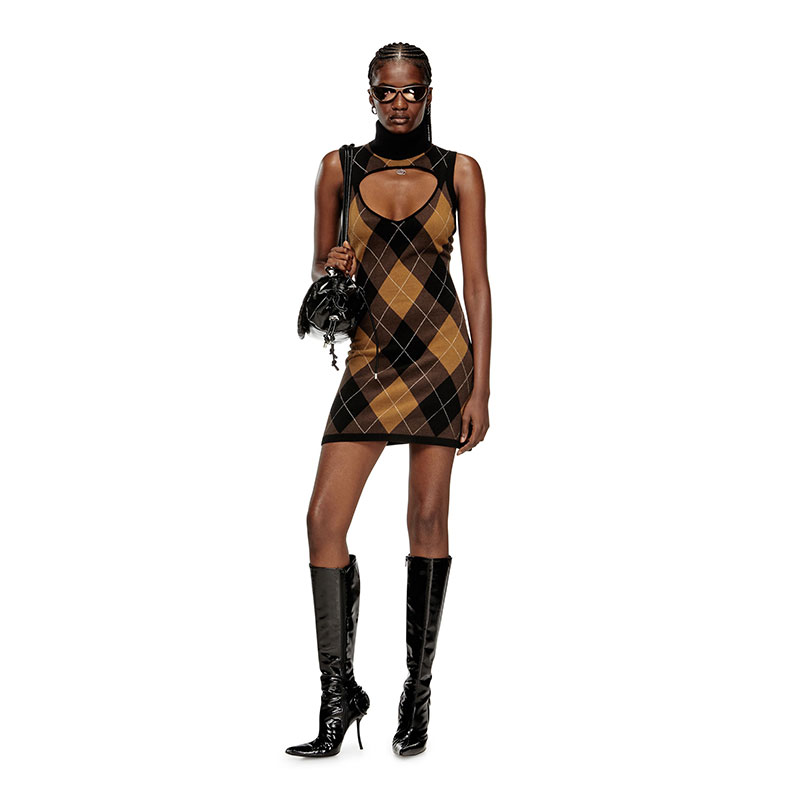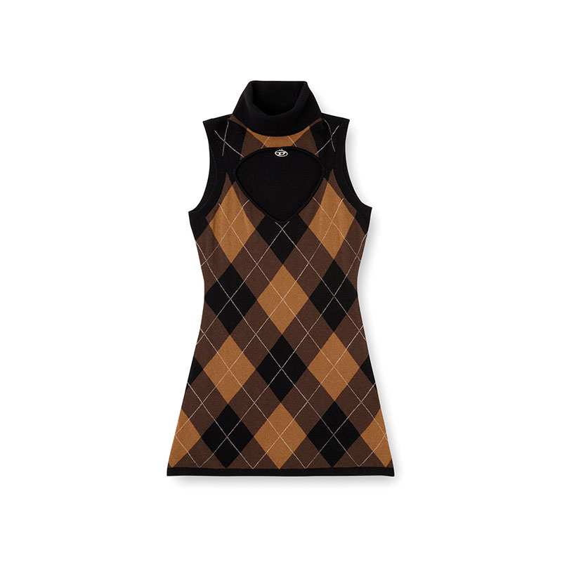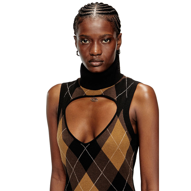 Sleeveless wool dress with front Argyle design and solid color on the back. It features a mock neck and a triangular inlay on the chest, highlighted by a pendant with the Oval D logo. The fit is regular.