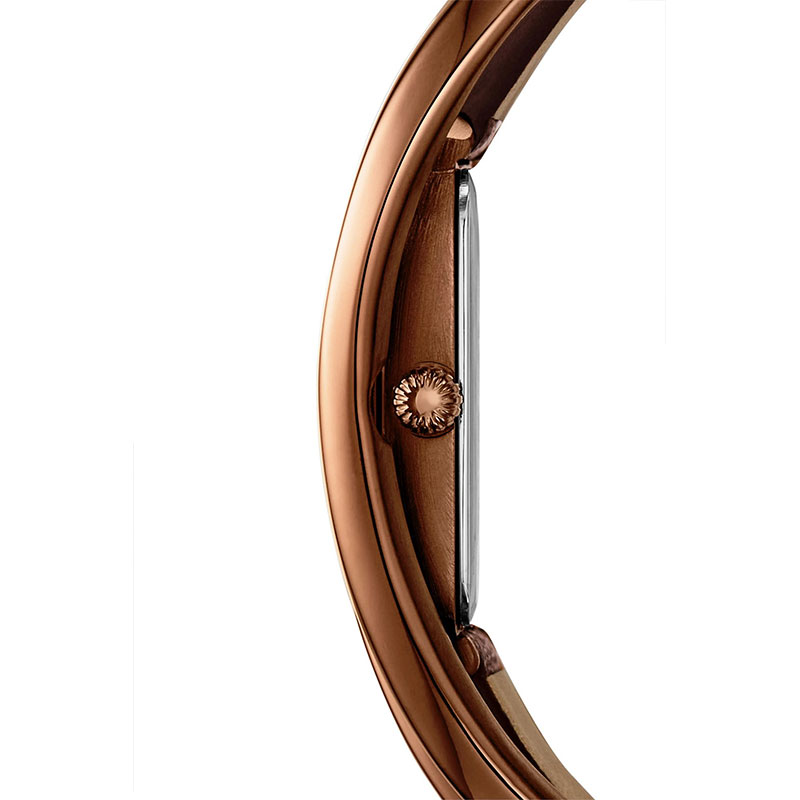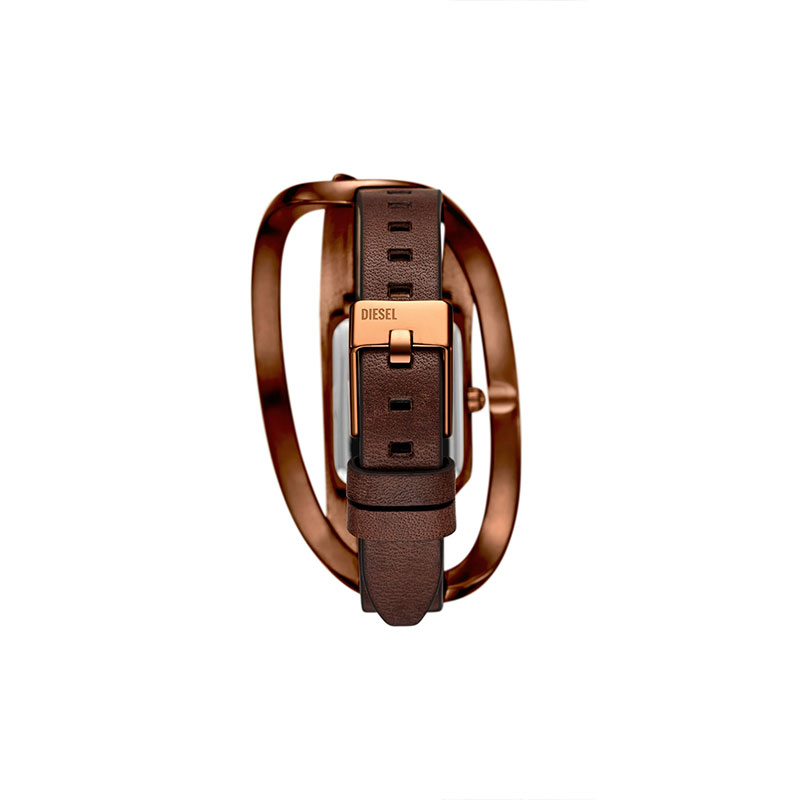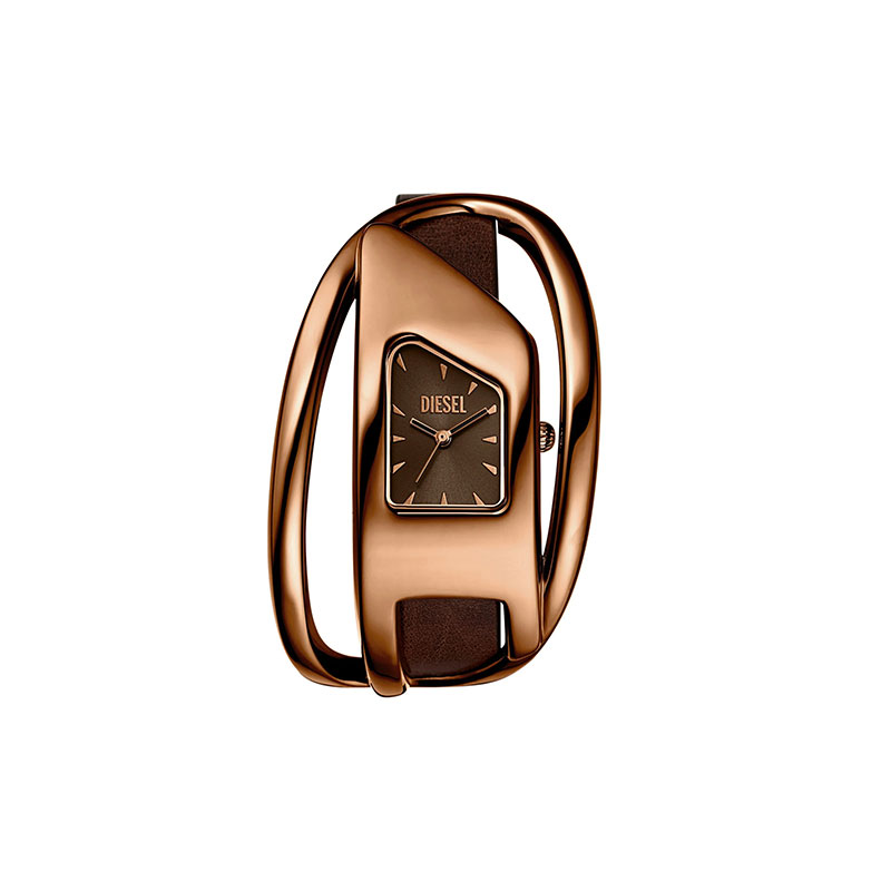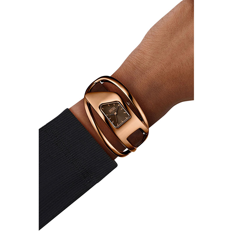 Diesel's 44mm Wrap-D watch features a brown sunray dial, three-hand movement, and a brown leather strap.