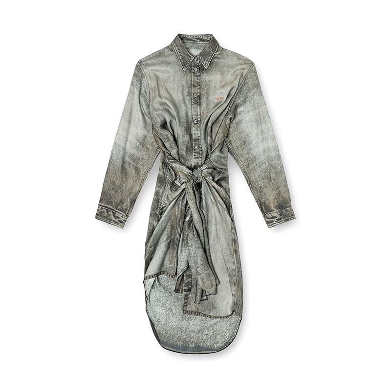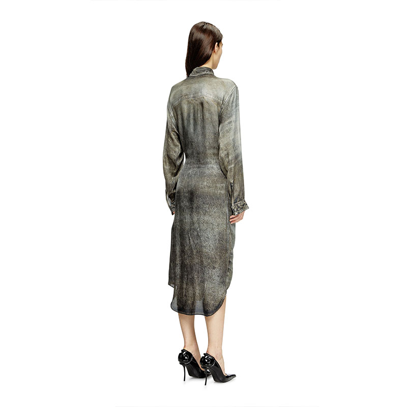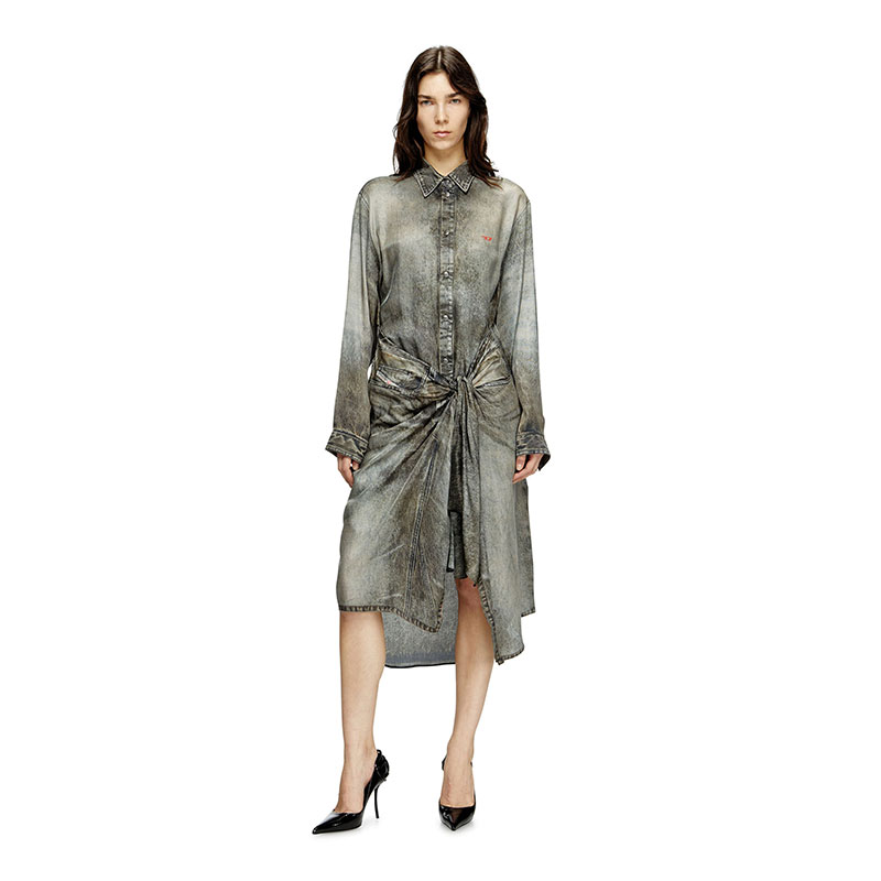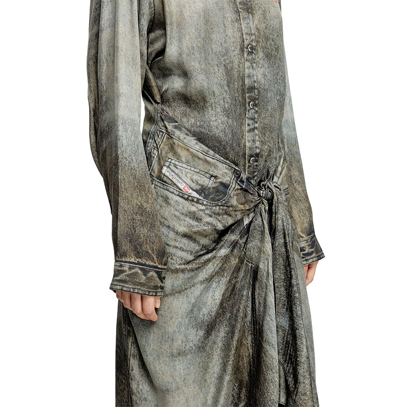 Women's relaxed shirt dress with asymmetrical wrap front. The fluid viscose fabric — made from half responsibly-sourced and half ECOVERO fibres — is printed to look like washed-out black denim, featuring trompe-l'oeil five-pocket detailing.