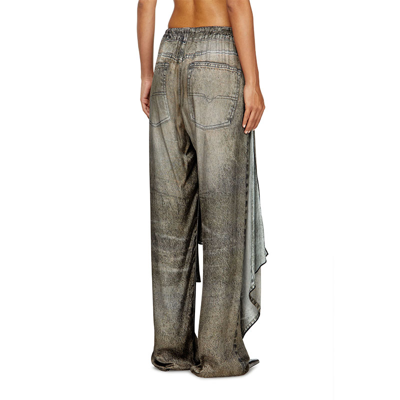 This women's pant-skirt hybrid hangs fluidly in viscose fabric, made from half responsibly-sourced and half ECOVERO fibres. The all-over digital print mimics washed-out black denim — note the trompe-l'oeil five-pocket detailing on both the base and tie-front overlay.
