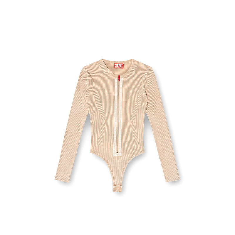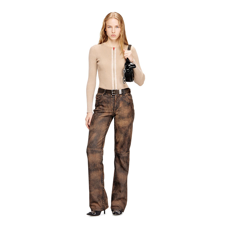 This women’s cardigan blends utilitarian cool with subtle, considered details. Rib-knitted from organic cotton, it has a close-fitting silhouette and a fabric-trimmed zip detailed with a red D logo pull. This garment is made up of both knitted and woven fabrics and dyed post-construction, resulting in tonal variations and lived-in appearance.