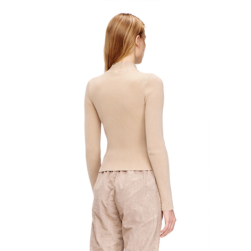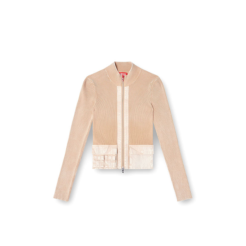 This women's black cardigan plays with saturation and fade. A utility-inflected mock-neck style, it’s rib-knitted from cotton and trimmed with marbled-effect denim – the fabric traces the zip and forms the multi-sized cargo pockets. The red lacquered D logo pull adds a signature touch.