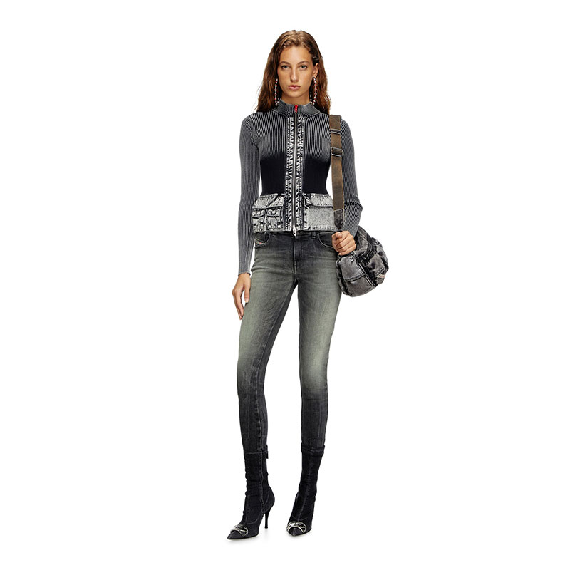 This women's black cardigan plays with saturation and fade. A utility-inflected mock-neck style, it’s rib-knitted from cotton and trimmed with marbled-effect denim – the fabric traces the zip and forms the multi-sized cargo pockets. The red lacquered D logo pull adds a signature touch.