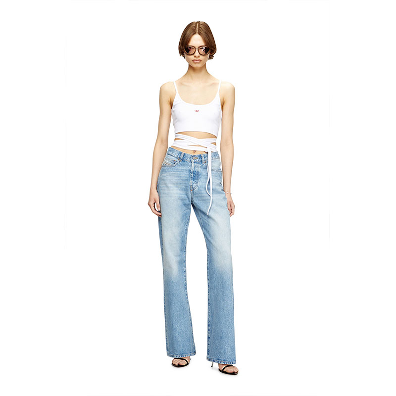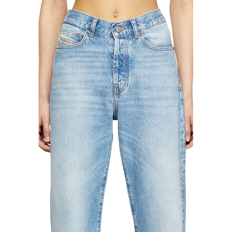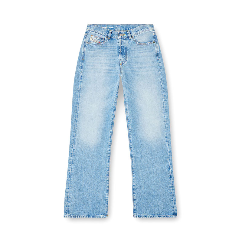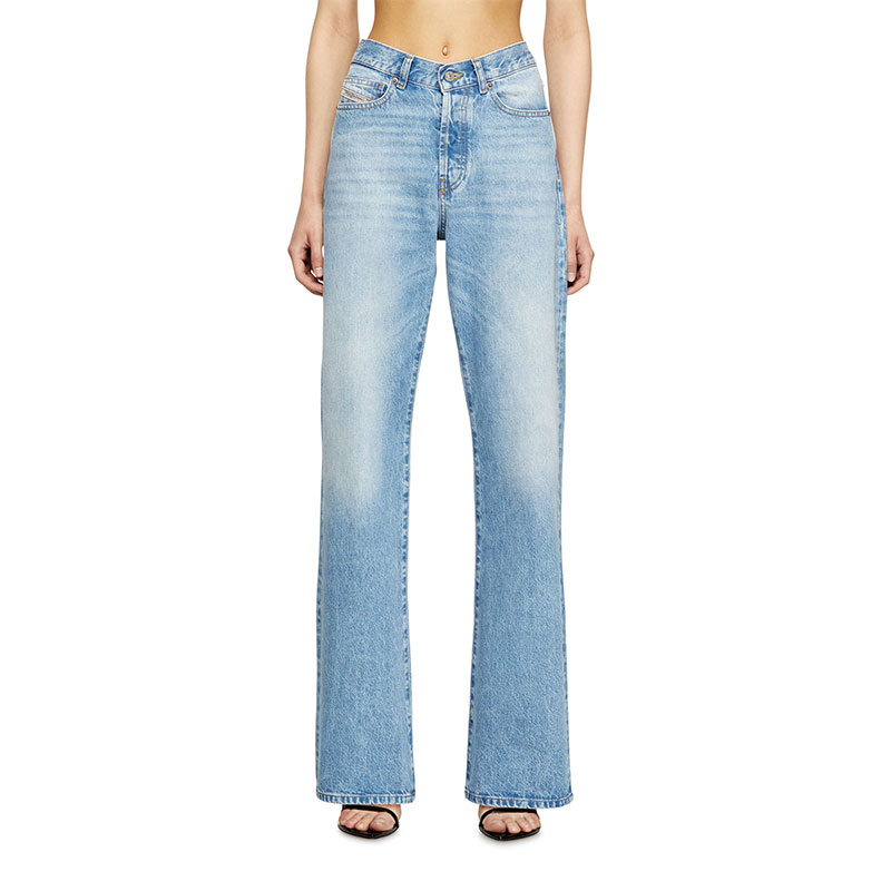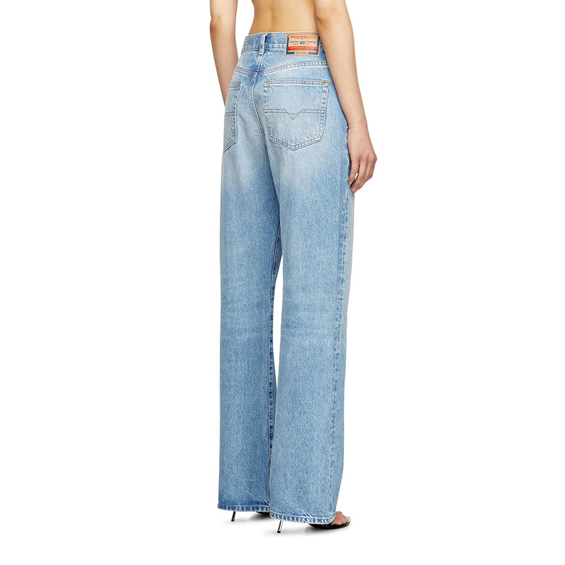 Regular fit with a straight leg. The waistband sits high on the waist and is designed to create a V-shaped front, tracing a feminine yet comfortable silhouette that embodies classic elegance. Fastened with a button fly.