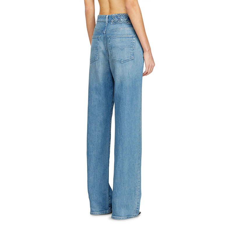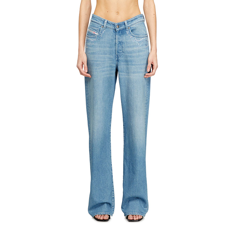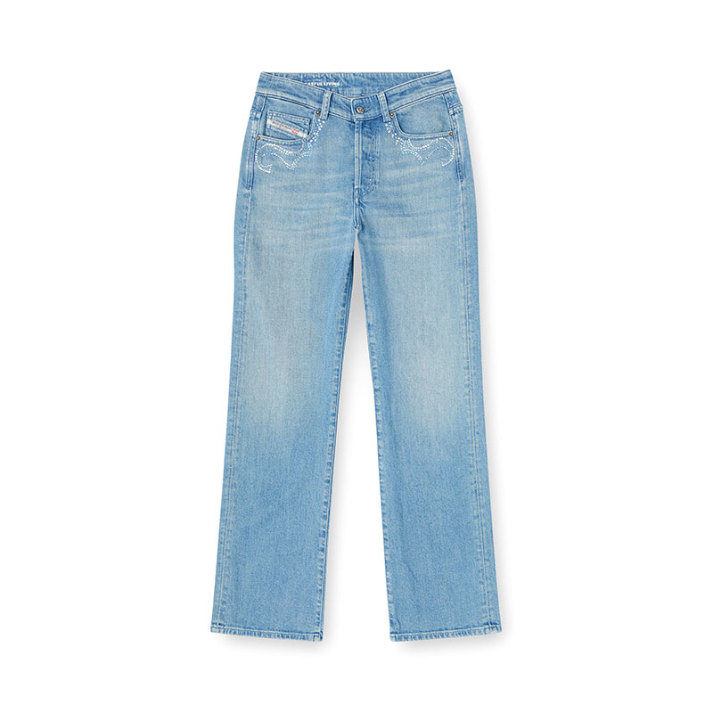 Crafted from fix denim in medium blue, this distinctive wash is enriched with sparkling micro stones on the front and an embroidered patch on the back pockets.