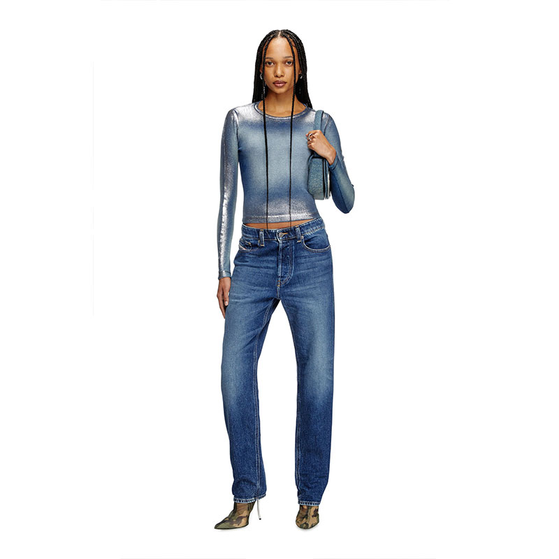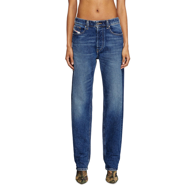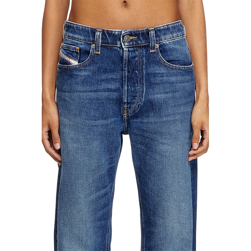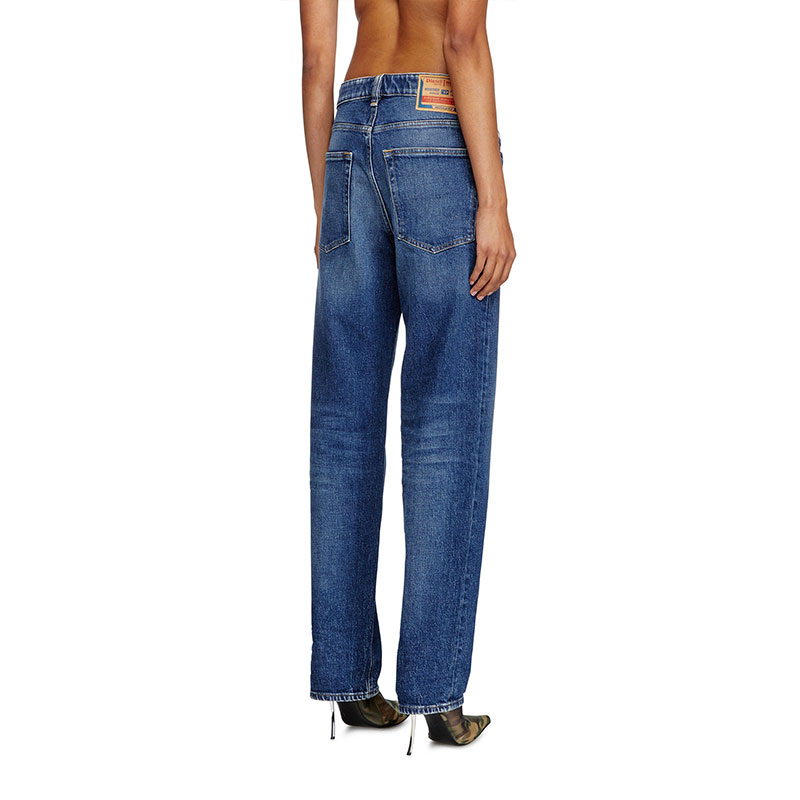 Loose style with a low waist and straight leg. The design is characterised by a cut-off waistband and subtly frayed pockets.