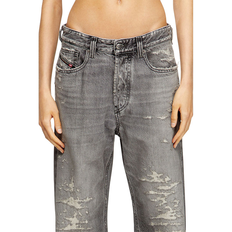 This fix denim is made using regenerative cotton and Distressed in Italy. The grey cast features a DNA destroyed look, with ripped and repaired abrasions that look like the jean has been scraped to reveal the inner construction of the fabric.