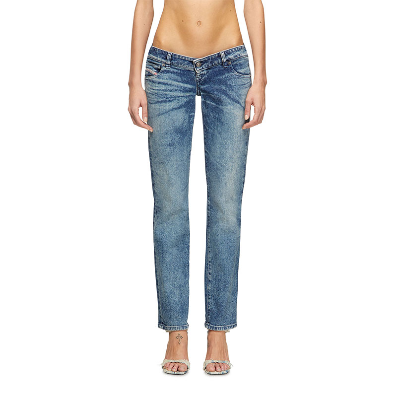 Regular fit with an extra-low waist, low crotch and straight leg. Designed with ultra-tight, adjustable underwear that keeps the jean securely in place, this eye-catching style delivers an extremely sleek bumster silhouette. Button fly.